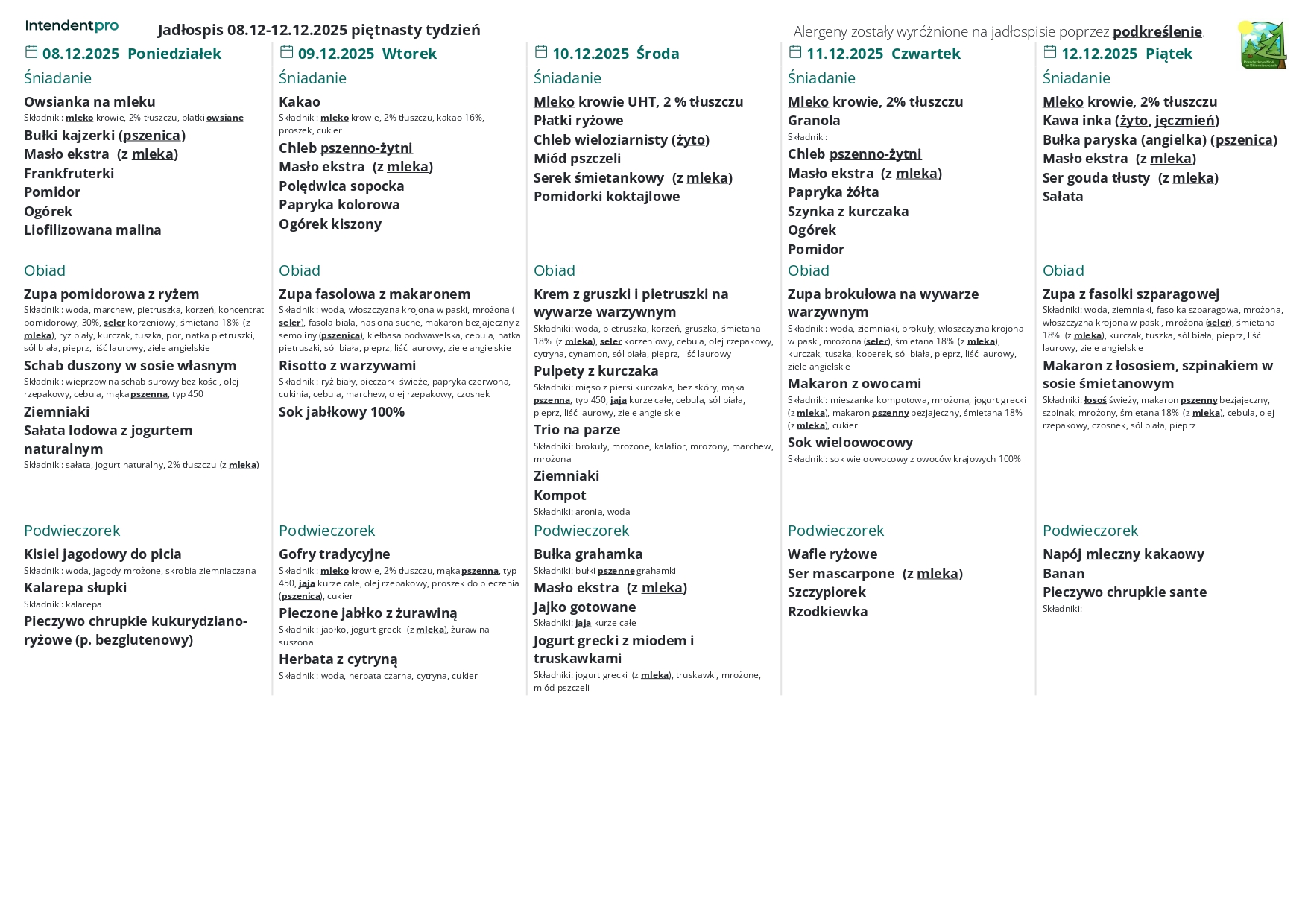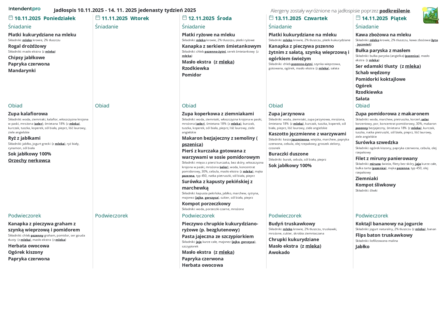 W związku z powyższym pod jadłospisem znajdziecie Państwo spis alergenów (od 1 do 14), a przy każdym posiłku (śniadanie, obiad, podwieczorek) numery alergenów jakie zawiera ten posiłek.
