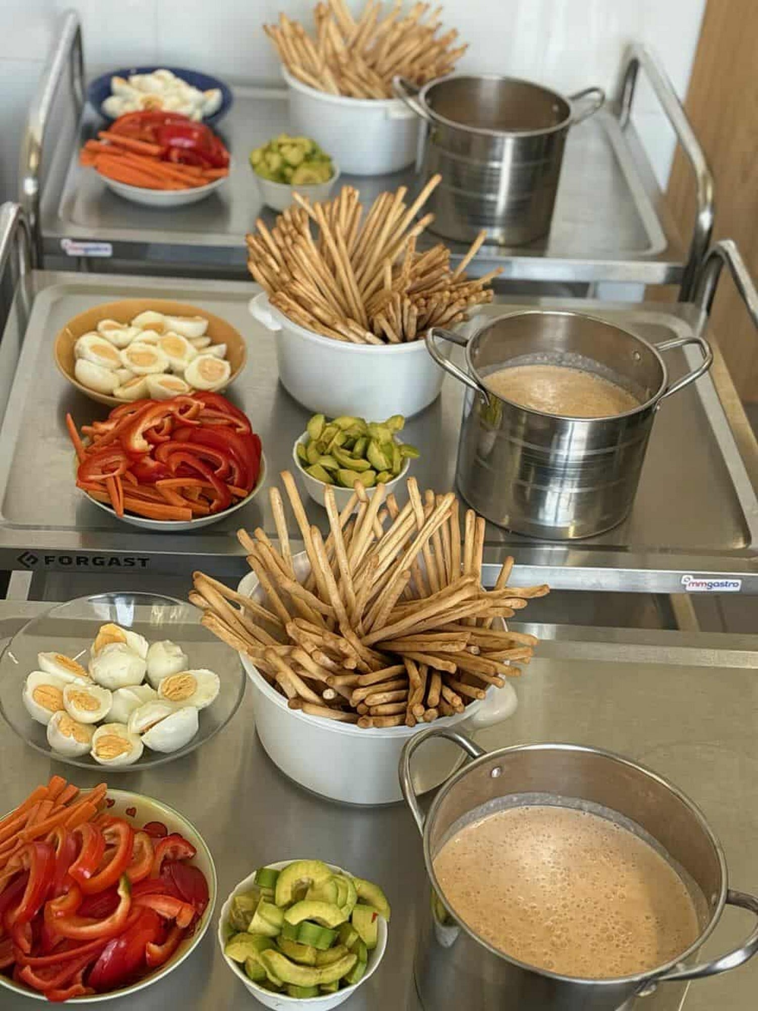 Obiad: zalewajka (marchew, pietruszka, seler, por, ziemniaki, barszcz biały, śmietana, kiełbasa, cebula, olej, czosnek), makaron z twarogiem, śmietaną i jogurtem greckim, pomidorki koktajlowe, kompot z aronii/woda