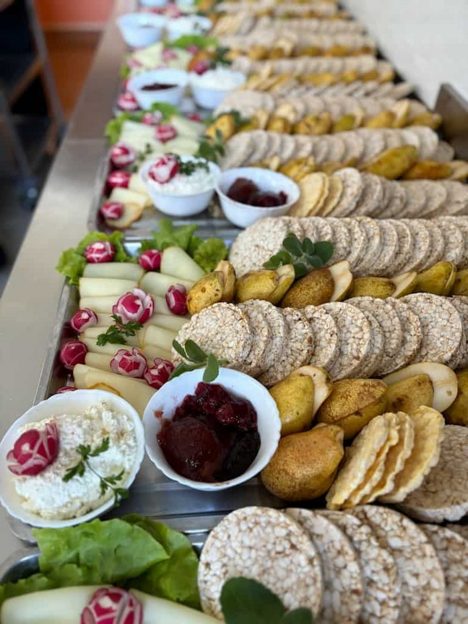Śniadanie: mleko, kawa inka, bułka angielka, masło, stół szwedzki (ser żółty, salami), roszponka, ogórek świeży, pomidorki