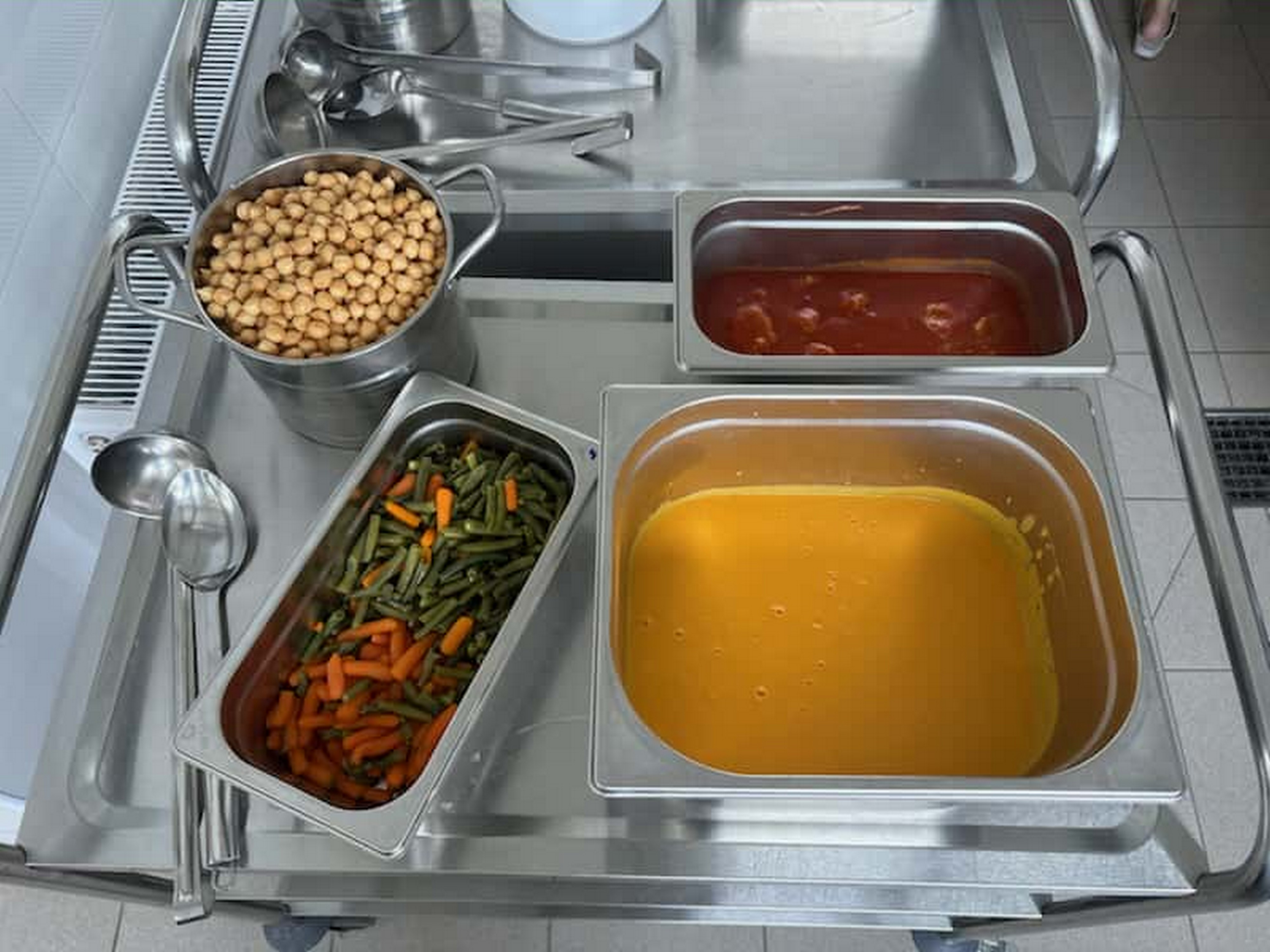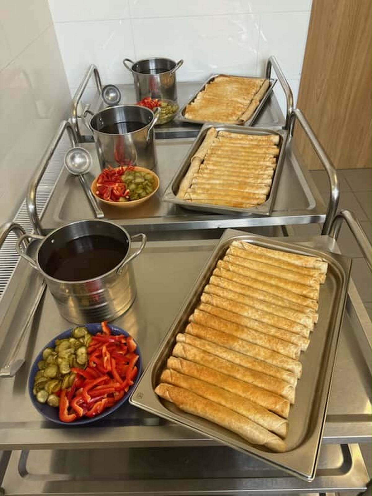 Obiad: zupa grochowa z koperkiem (włoszczyzna, ziemniaki, groch, kiełbasa, cebula, olej), kasza jaglana, gyros drobiowy, dip tzatzyki (jogurt, ogórek świeży, czosnek), buraczki, kompot porzeczkowy/woda