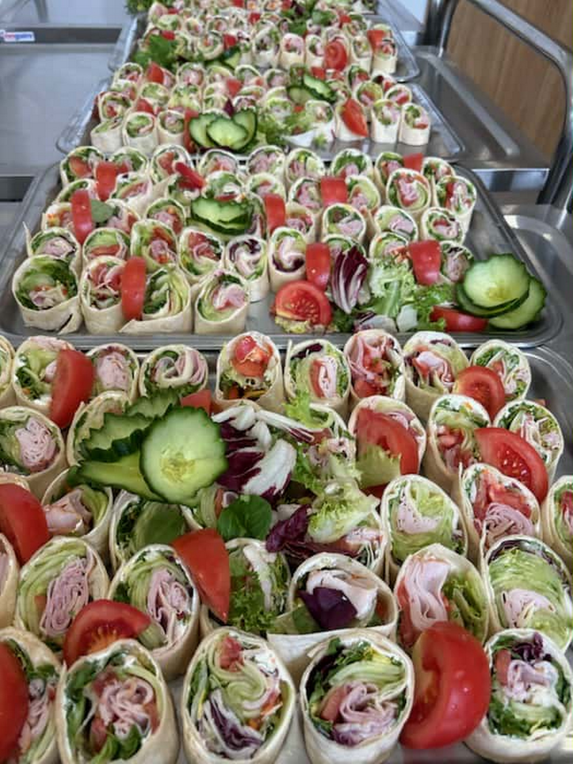 Podwieczorek: mini hot-dog, parówka z szynki, ketchup, pomidor, ogórek świeży, herbata z miodem i cytryną