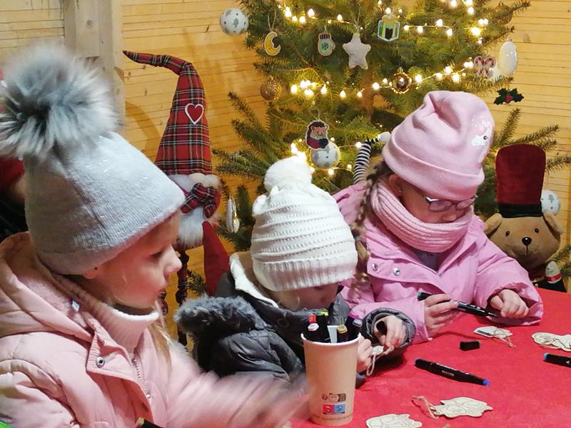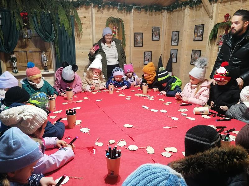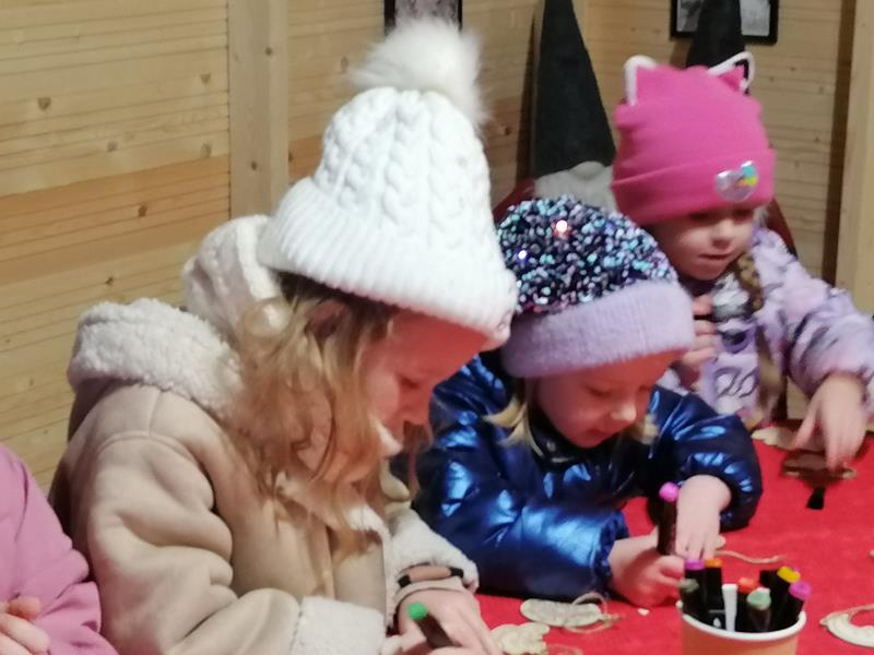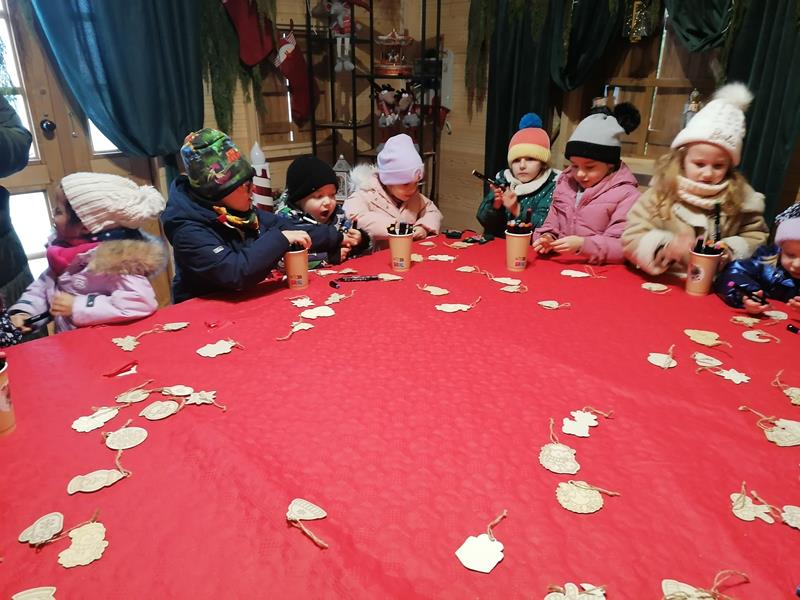 Święty Mikołaj wraz z Elfami przygotował dla dzieci warsztaty - kolorowanie drewnianych ozdób na choinkę.