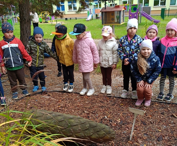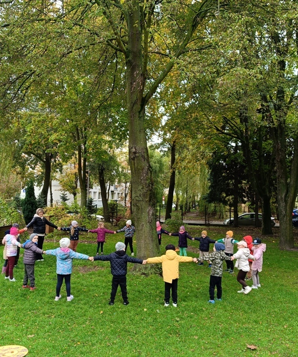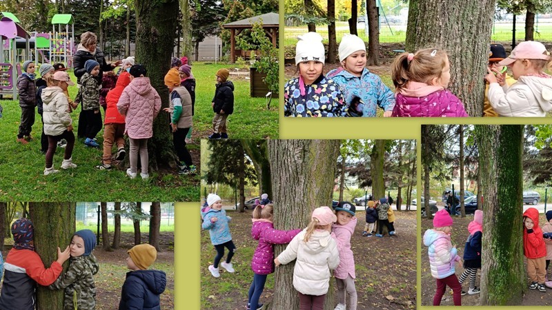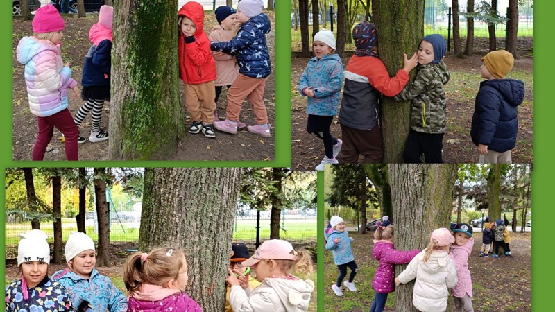Wspólny spacer pozwolił wszystkim ciekawskim przedszkolakom dotknąć, powąchać i przytulić drzewa rosnące na terenie przedszkola.