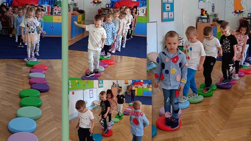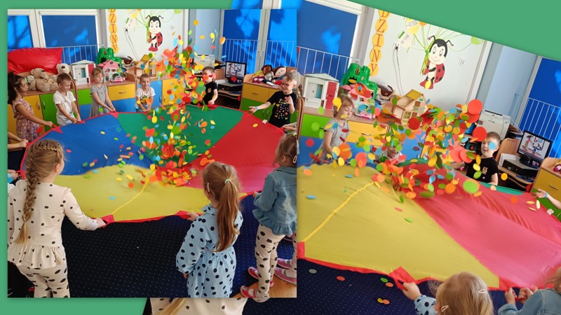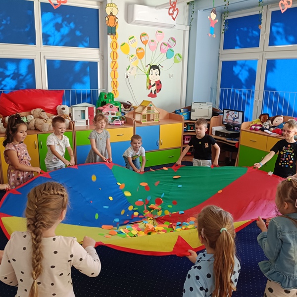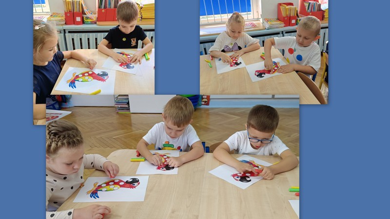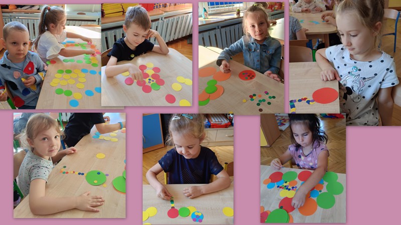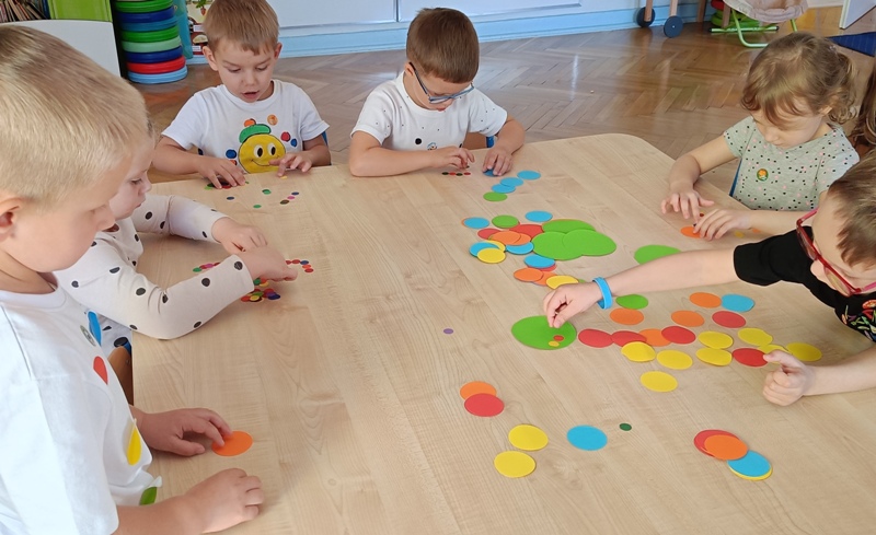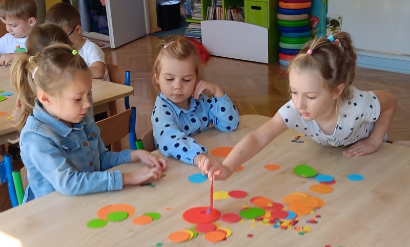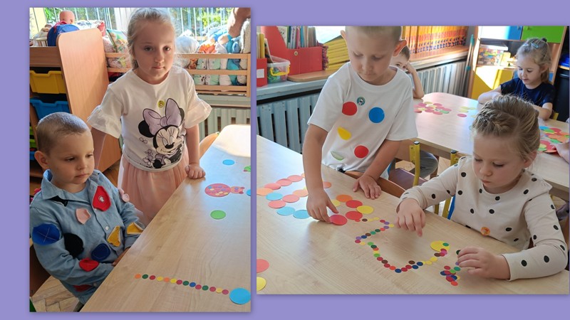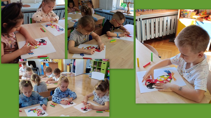 „Biedronki” przechodziły po moście utworzonym z kolorowych krążków, bawiły się z chustą animacyjną i kolorowymi kropkami, odczytywały kody z planszy, wyklejały papugę plastelinowymi kropkami, układały kompozycje z kółek różnej wielkości i koloru, rozwijając przy tym swoje twórcze myślenie i kreatywność. Było kolorowo, kropkowo i radośnie.