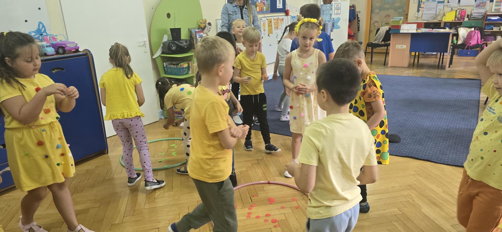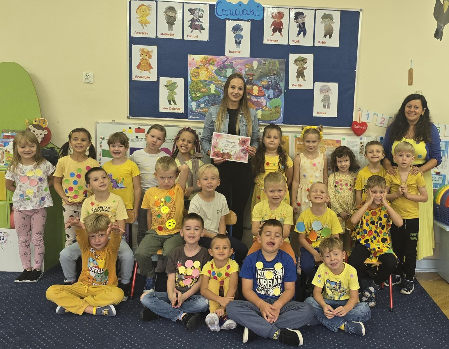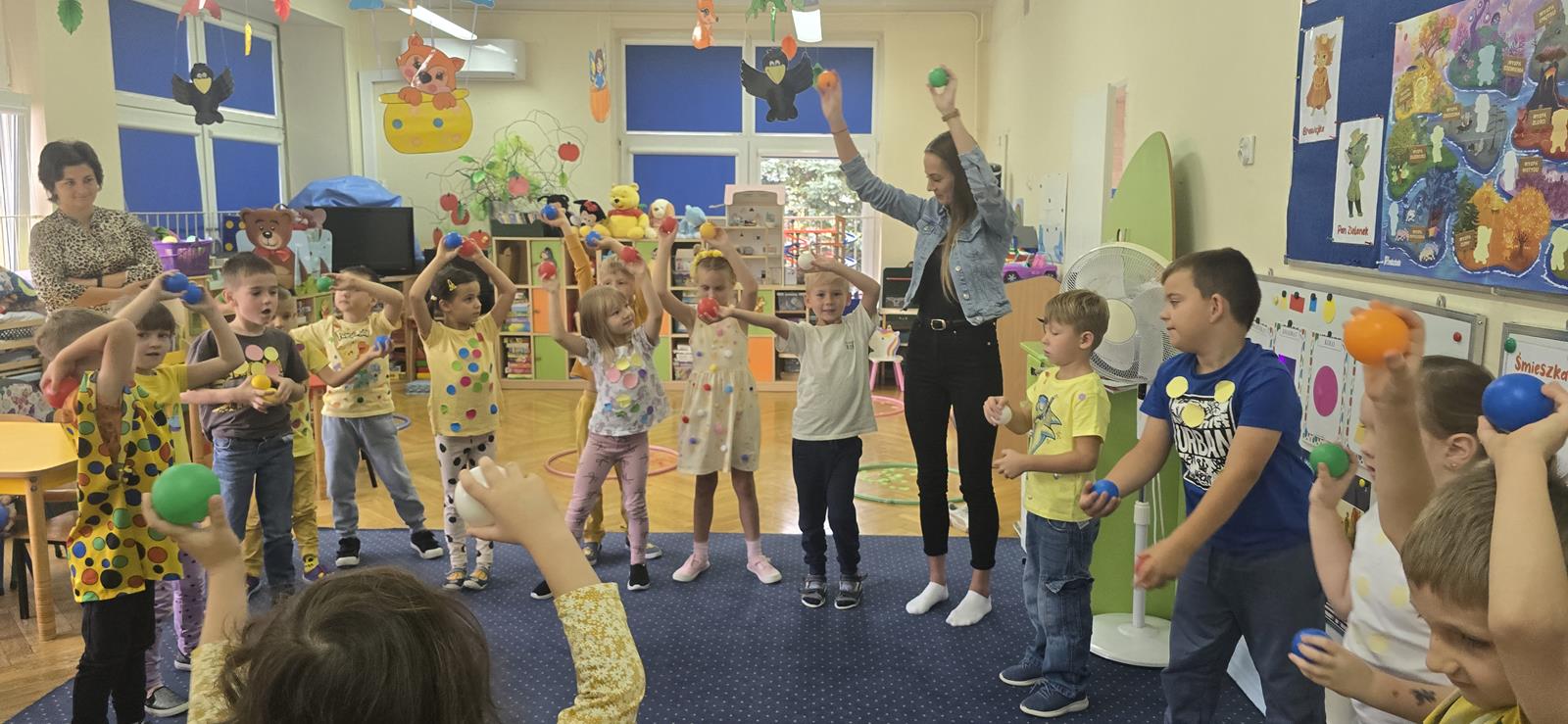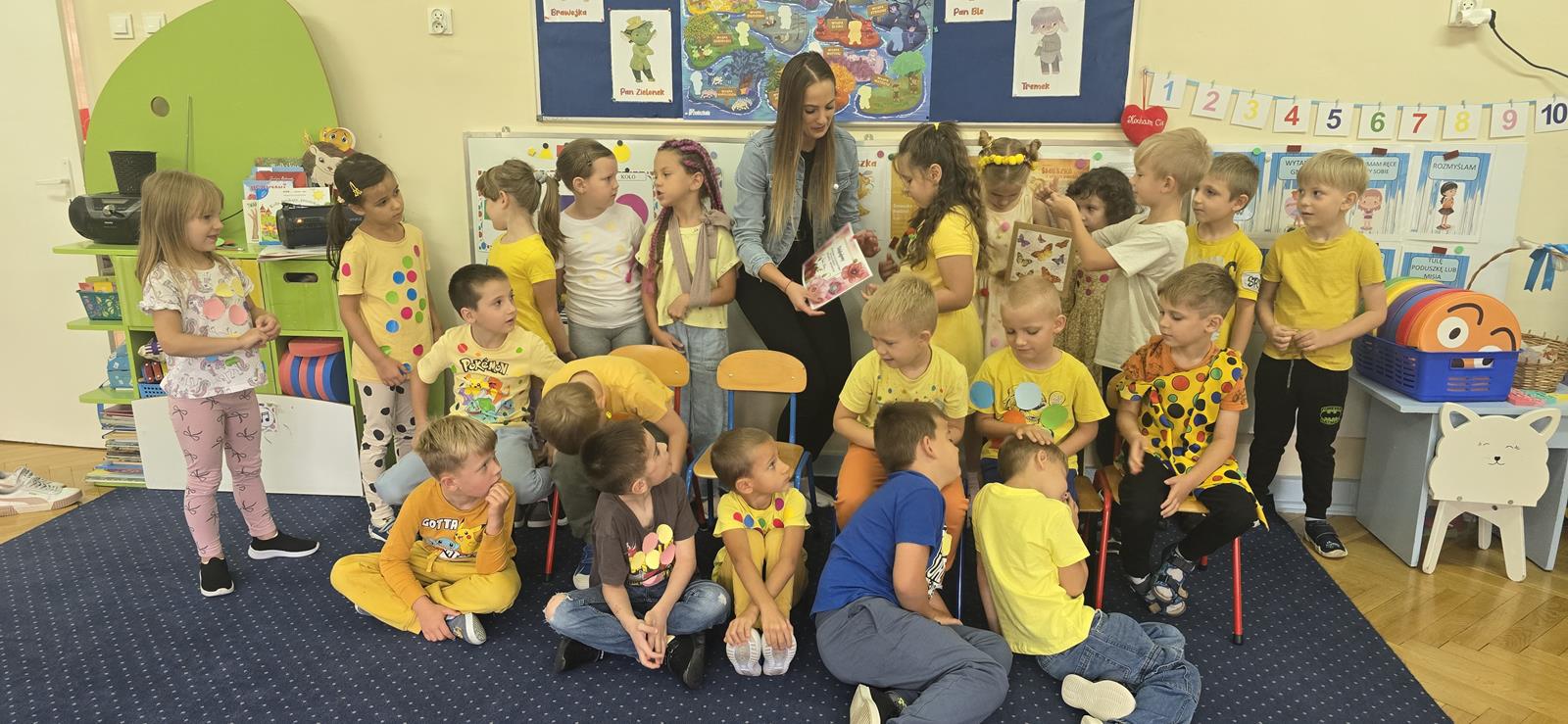 17.09.25 r. "Motylki" Dzień Kropki ze Śmieszką z Krainy Radości obchodziły, mamę Oskarka - panią Olę, do swej sali na spotkanie czytelnicze zaprosiły, opowiadanie pt. "Śmieszka z Wyspy Radości" wysłuchały, z piosenką projektową "Czuciaki z Krainy Emocji" się zapoznały, na temat emocji "radość" się wypowiadały, w wesołych zabawach muzyczno - ruchowych i rytmicznych uczestniczyły, w magicznej skrzyni za pomocą różnych zmysłów okrągłe przedmioty rozpoznawały i radosne rysunki wykonały.