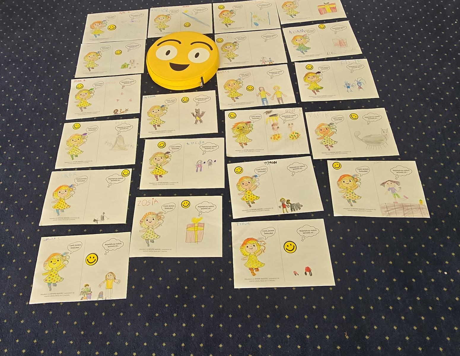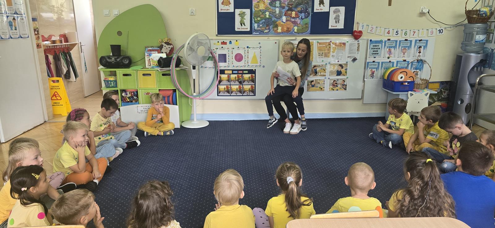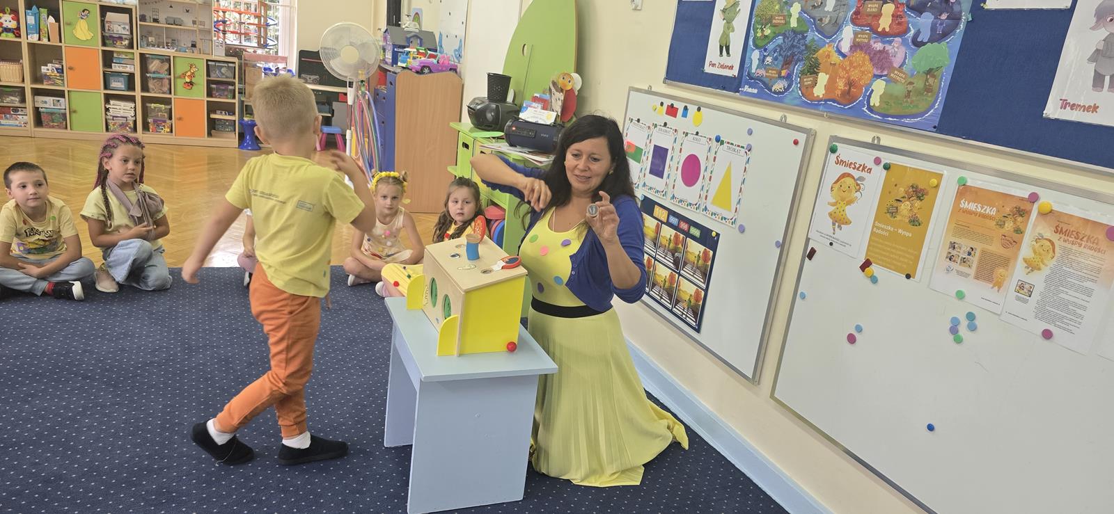 17.09.25 r. "Motylki" Dzień Kropki ze Śmieszką z Krainy Radości obchodziły, mamę Oskarka - panią Olę, do swej sali na spotkanie czytelnicze zaprosiły, opowiadanie pt. "Śmieszka z Wyspy Radości" wysłuchały, z piosenką projektową "Czuciaki z Krainy Emocji" się zapoznały, na temat emocji "radość" się wypowiadały, w wesołych zabawach muzyczno - ruchowych i rytmicznych uczestniczyły, w magicznej skrzyni za pomocą różnych zmysłów okrągłe przedmioty rozpoznawały i radosne rysunki wykonały.