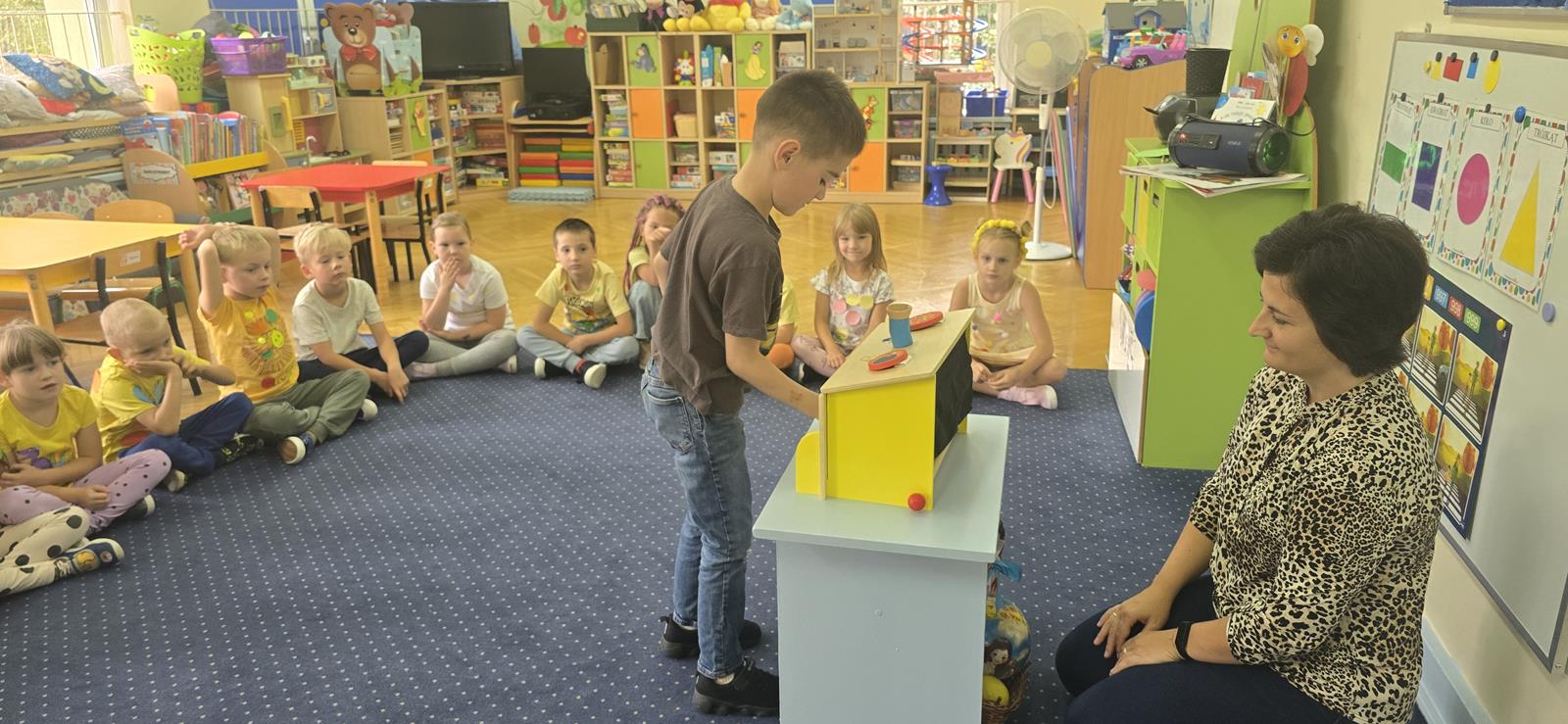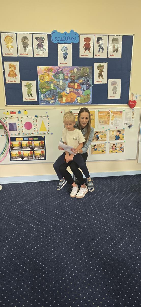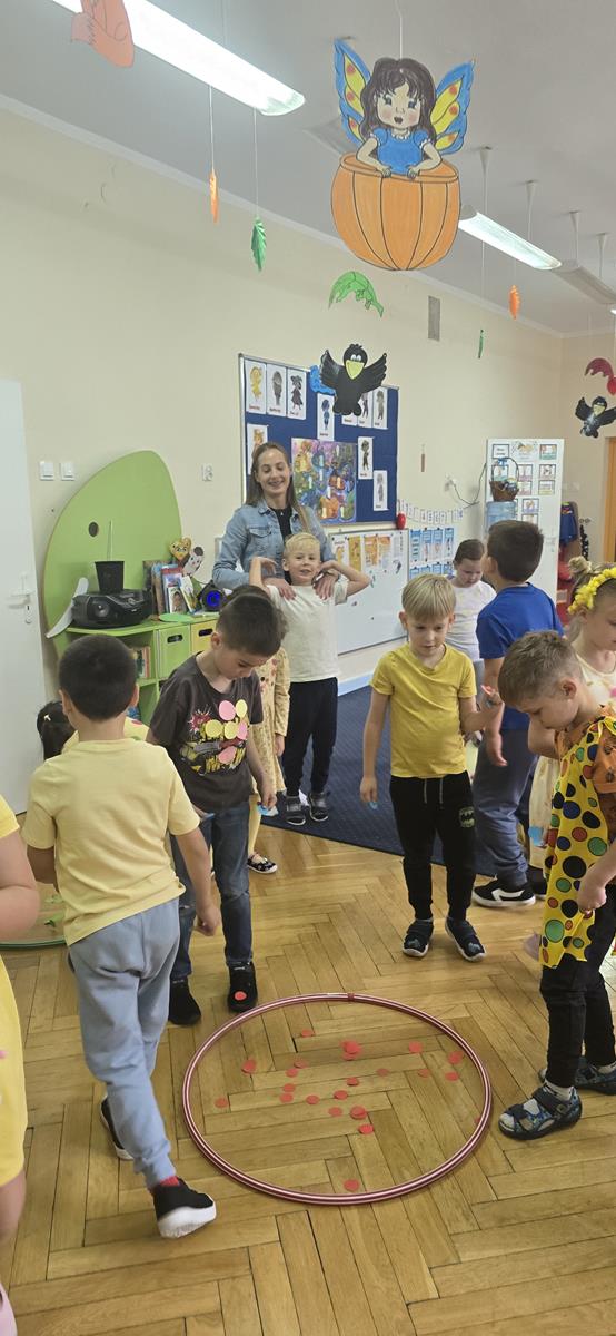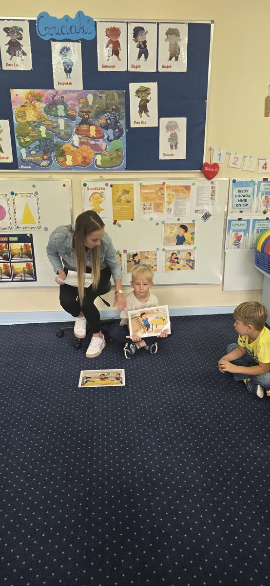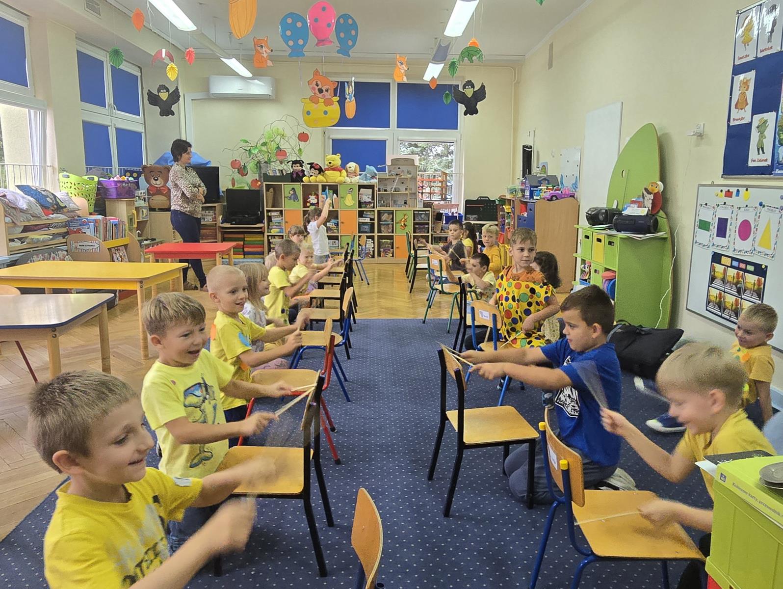 17.09.25 r. "Motylki" Dzień Kropki ze Śmieszką z Krainy Radości obchodziły, mamę Oskarka - panią Olę, do swej sali na spotkanie czytelnicze zaprosiły, opowiadanie pt. "Śmieszka z Wyspy Radości" wysłuchały, z piosenką projektową "Czuciaki z Krainy Emocji" się zapoznały, na temat emocji "radość" się wypowiadały, w wesołych zabawach muzyczno - ruchowych i rytmicznych uczestniczyły, w magicznej skrzyni za pomocą różnych zmysłów okrągłe przedmioty rozpoznawały i radosne rysunki wykonały.