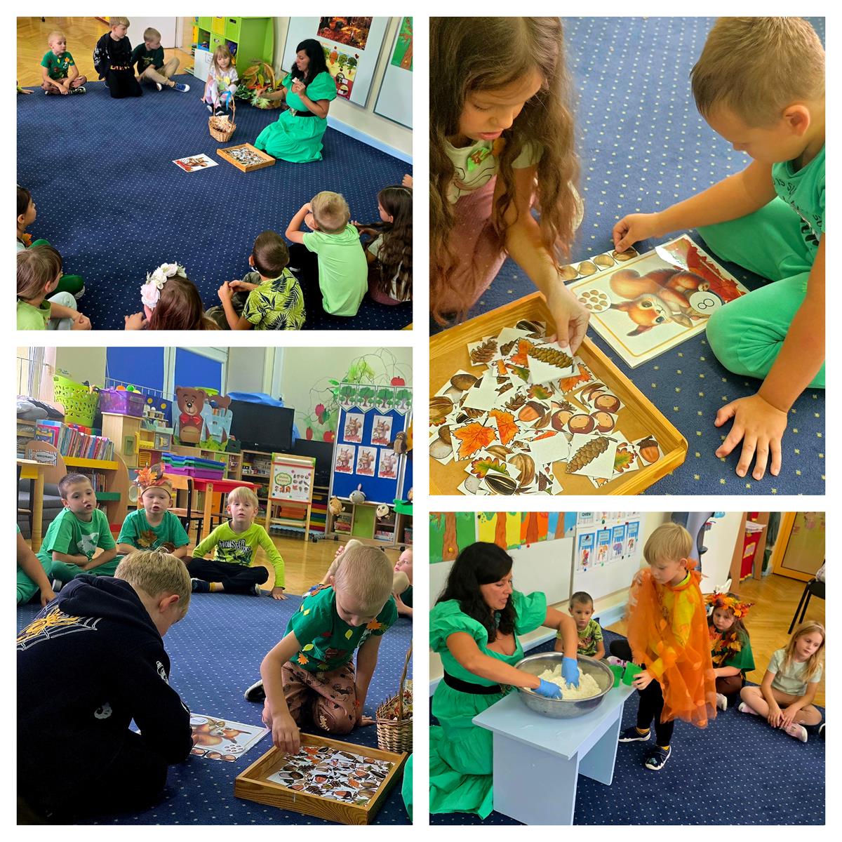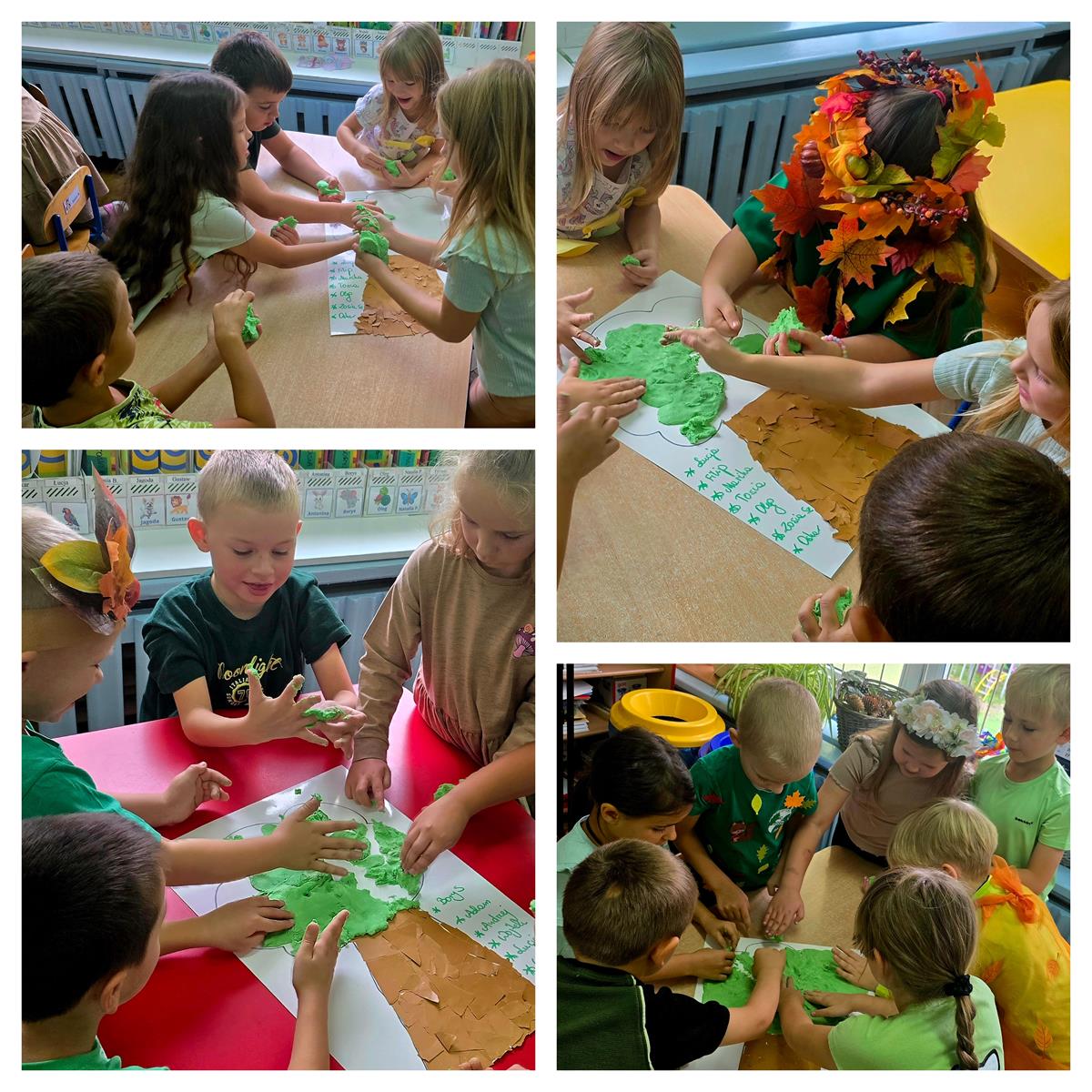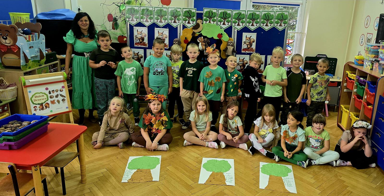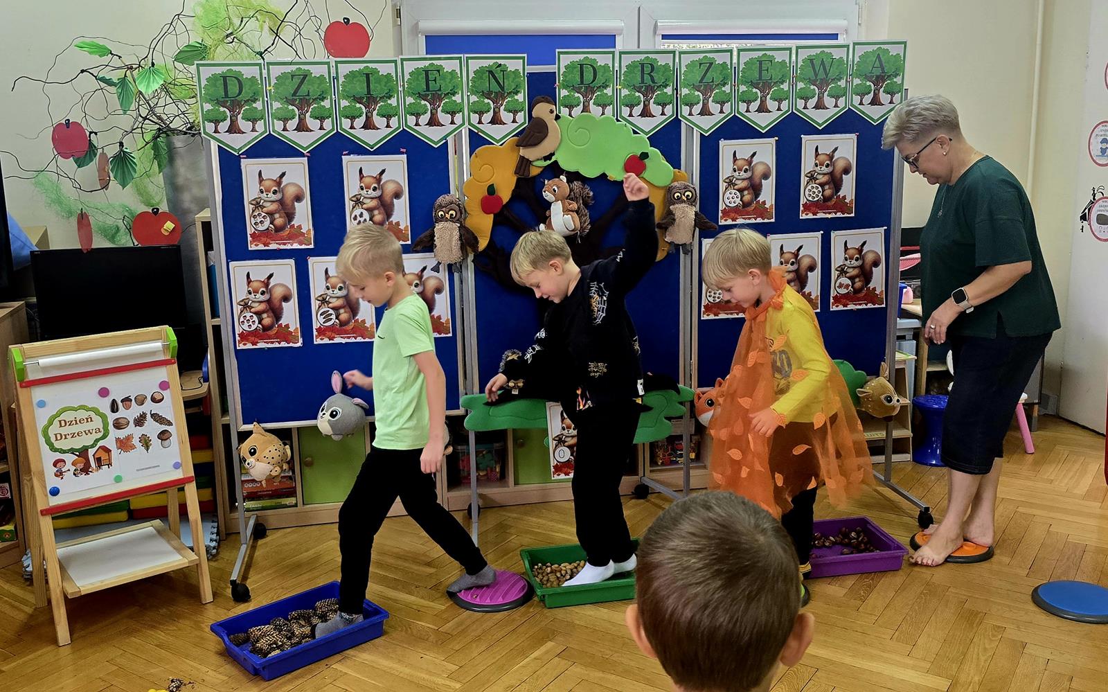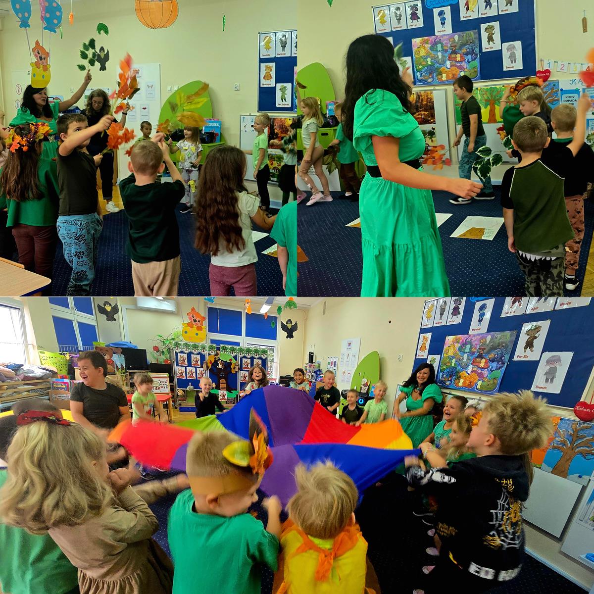 7.10.25 r. "Motylki" w zielonych strojach przyozdobionych kolorowymi listkami do przedszkola przybyły i w spotkaniu czytelniczym, zorganizowanym z okazji Dnia Drzewa, z p. psycholog uczestniczyły, historii "Wiewiórek, które nie umiały się dzielić" wysłuchały, w spiżarni rudych wiewióreczek zawitały i dary jesieni przeliczały, w kasztankowej zabawie z chustą animacyjną uczestniczyły, jesienne listki jako rekwizyty do zabaw muzyczno - ruchowych wykorzystały i w zabawie badawczej związanej z tworzeniem zielonej masy solnej udział brały. Następnie w grupkach piękne drzewka stworzyły i po ścieżce sensorycznej stworzonej z darów jesieni kroczyły. Zabawa była doskonała.