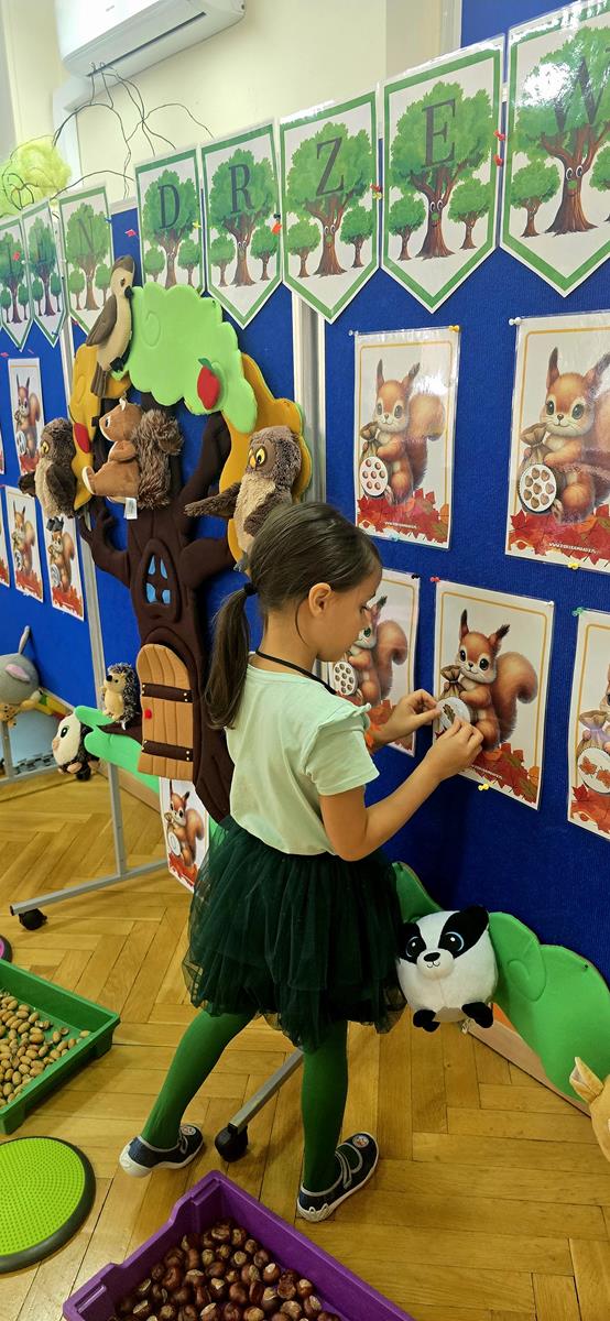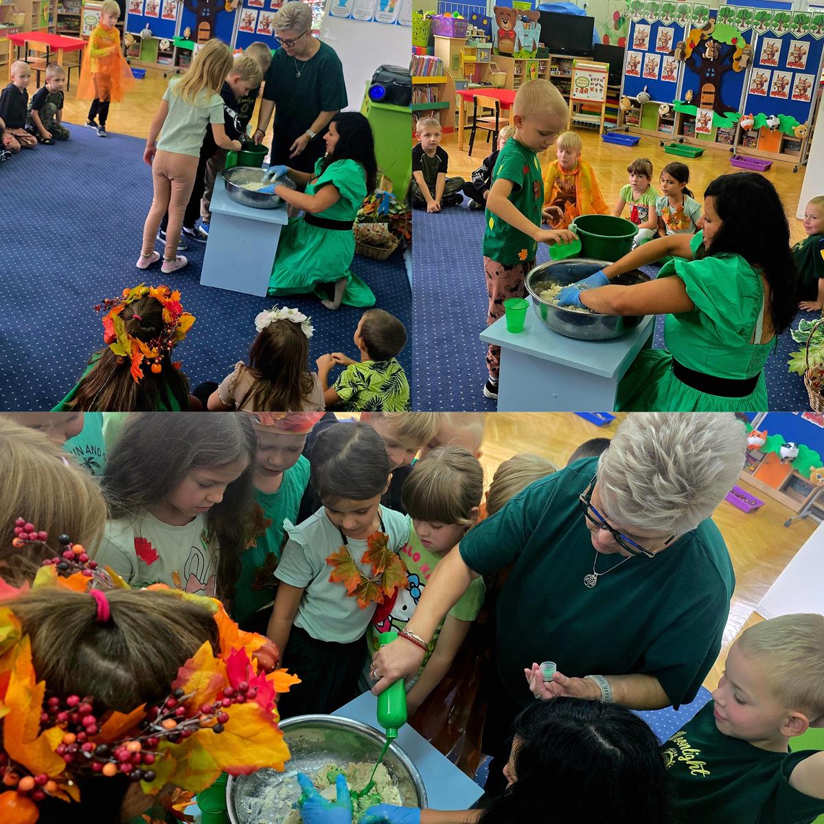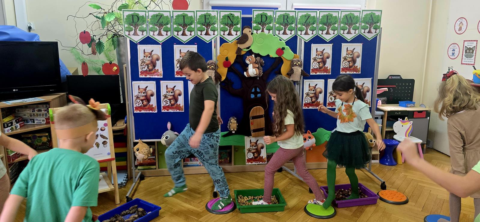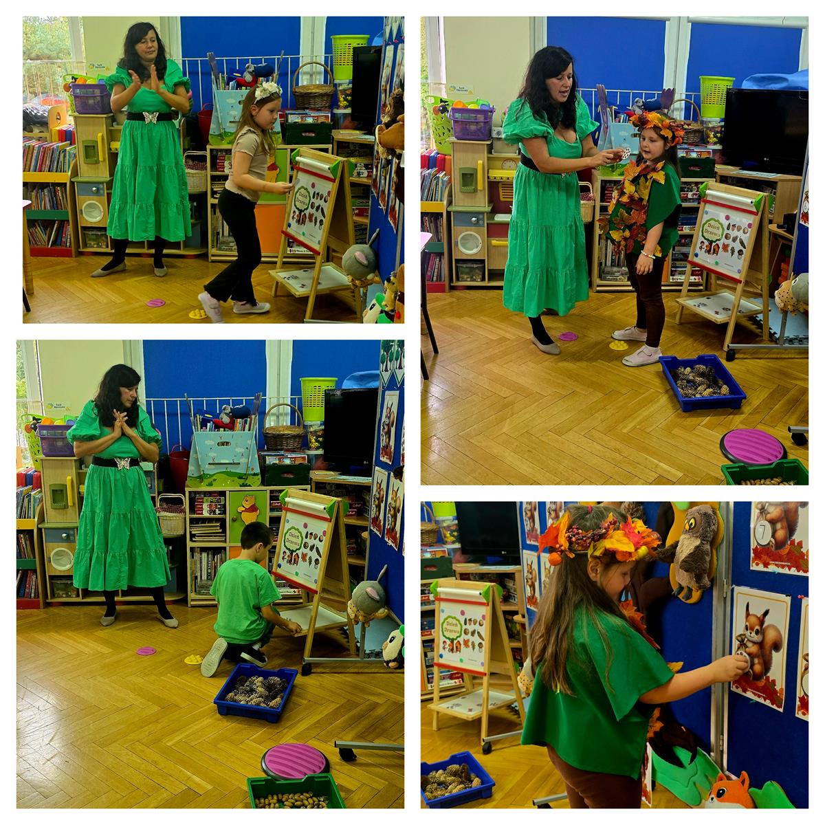 7.10.25 r. "Motylki" w zielonych strojach przyozdobionych kolorowymi listkami do przedszkola przybyły i w spotkaniu czytelniczym, zorganizowanym z okazji Dnia Drzewa, z p. psycholog uczestniczyły, historii "Wiewiórek, które nie umiały się dzielić" wysłuchały, w spiżarni rudych wiewióreczek zawitały i dary jesieni przeliczały, w kasztankowej zabawie z chustą animacyjną uczestniczyły, jesienne listki jako rekwizyty do zabaw muzyczno - ruchowych wykorzystały i w zabawie badawczej związanej z tworzeniem zielonej masy solnej udział brały. Następnie w grupkach piękne drzewka stworzyły i po ścieżce sensorycznej stworzonej z darów jesieni kroczyły. Zabawa była doskonała.