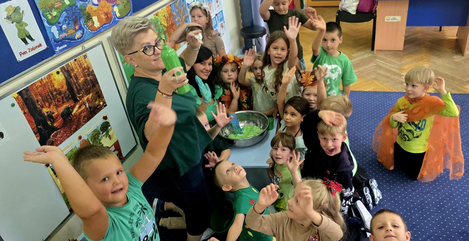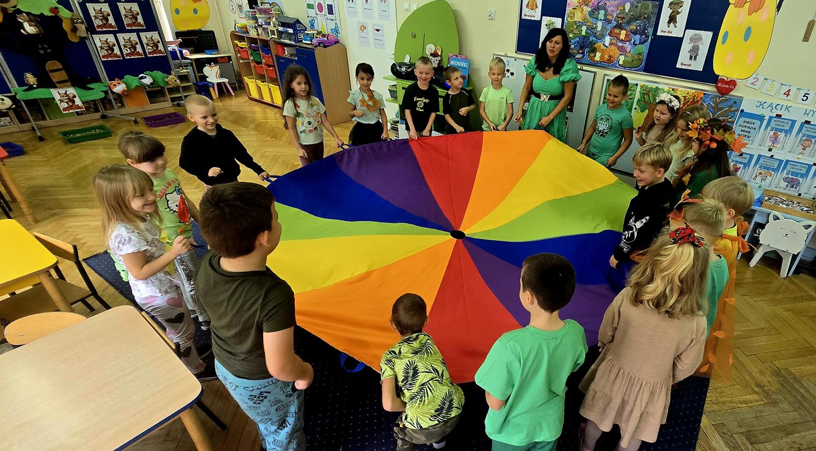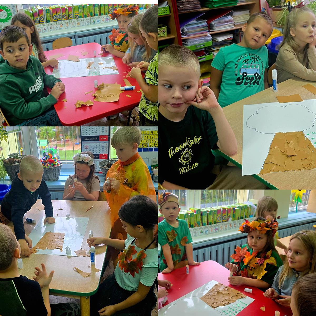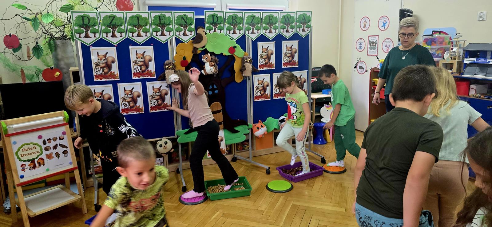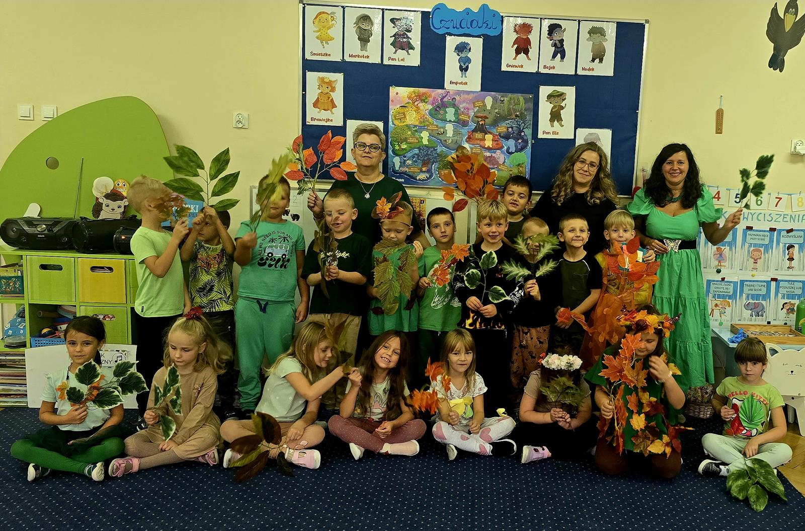 7.10.25 r. "Motylki" w zielonych strojach przyozdobionych kolorowymi listkami do przedszkola przybyły i w spotkaniu czytelniczym, zorganizowanym z okazji Dnia Drzewa, z p. psycholog uczestniczyły, historii "Wiewiórek, które nie umiały się dzielić" wysłuchały, w spiżarni rudych wiewióreczek zawitały i dary jesieni przeliczały, w kasztankowej zabawie z chustą animacyjną uczestniczyły, jesienne listki jako rekwizyty do zabaw muzyczno - ruchowych wykorzystały i w zabawie badawczej związanej z tworzeniem zielonej masy solnej udział brały. Następnie w grupkach piękne drzewka stworzyły i po ścieżce sensorycznej stworzonej z darów jesieni kroczyły. Zabawa była doskonała.