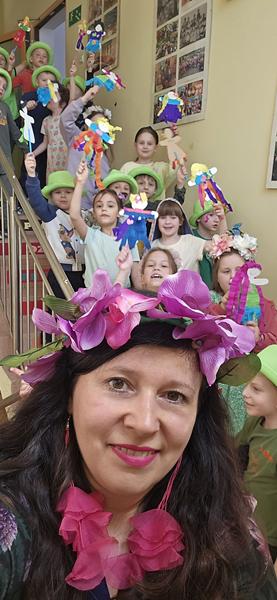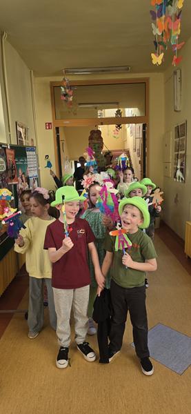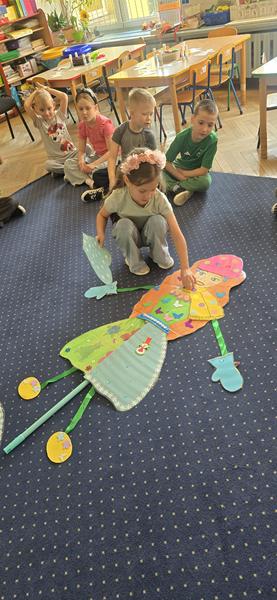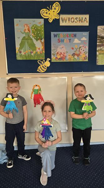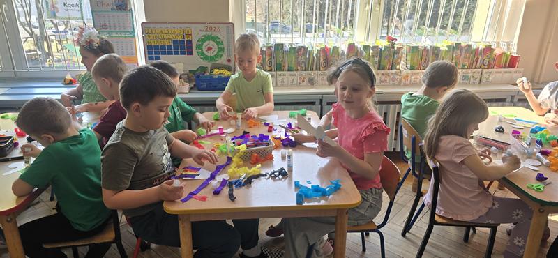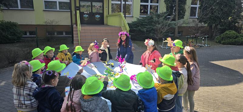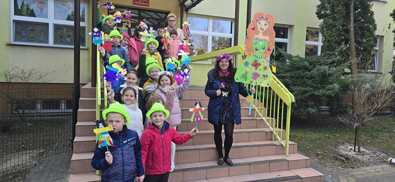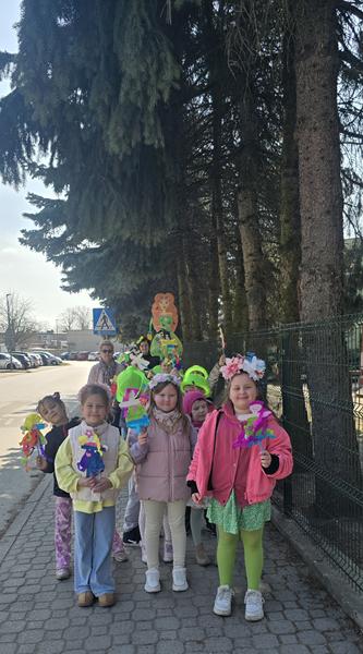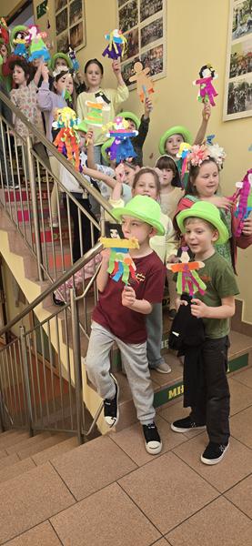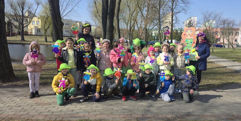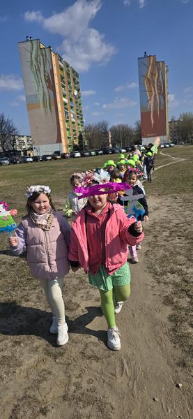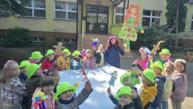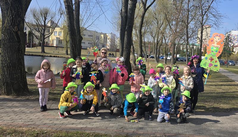 23.03.2026 r. Motylki w zielonych strojach do przedszkola przybyły i własne marzanny tworzyły. Pierwszy Dzień Wiosny świętowały, oznak wiosny podczas spaceru po osiedlu Widok szukały i swoje marzanny w symbolicznej rzece stworzonej z materiału żegnały.