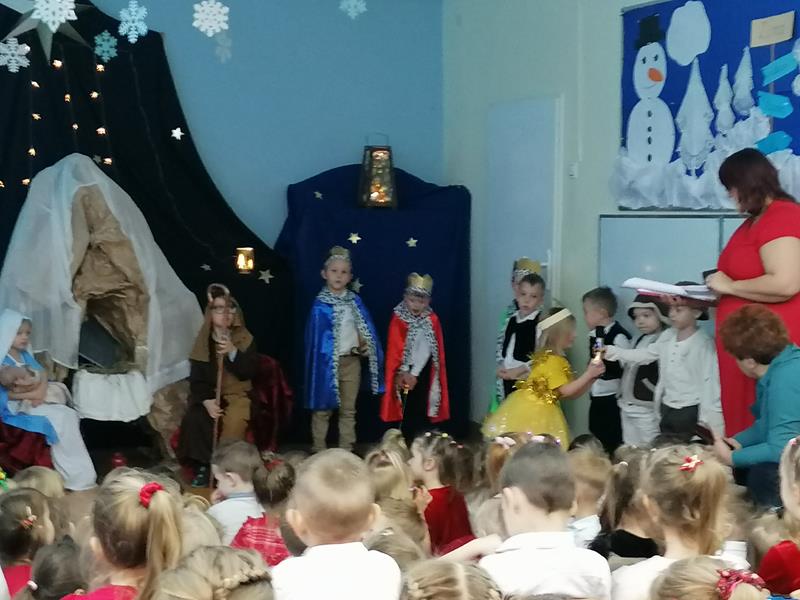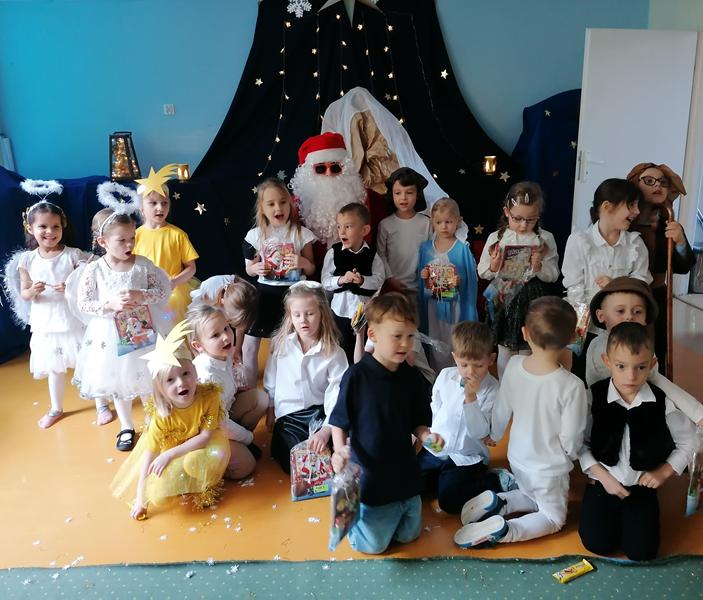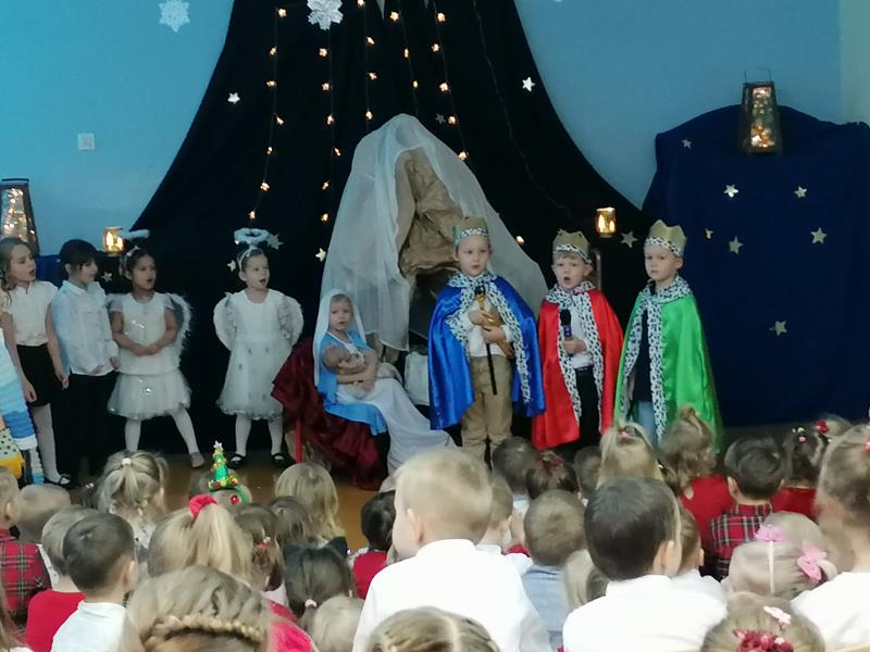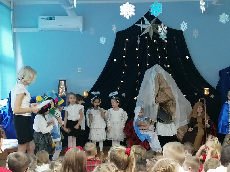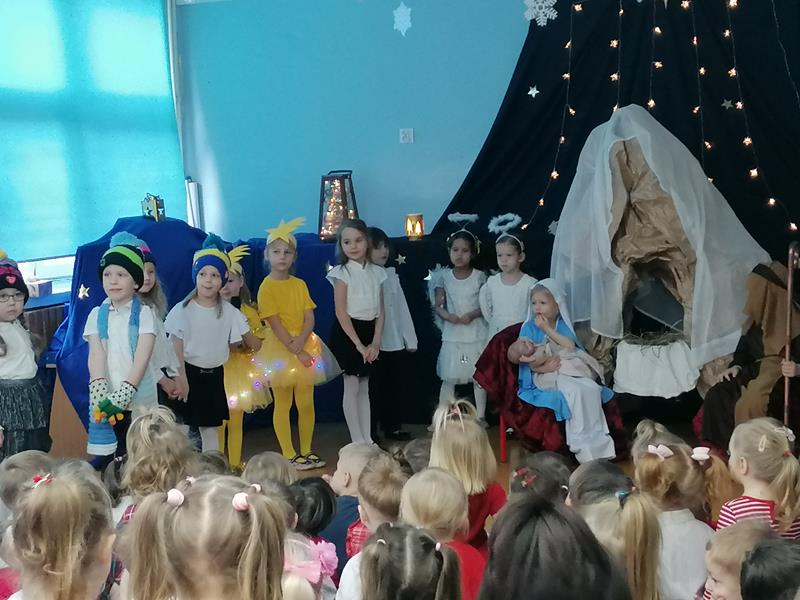 19 grudnia 2025r. sala "Stokrotek" zmieniła swoje oblicze: pojawiło się rozgwieżdżone niebo, stajenka ze żłóbkiem oraz dzieci w pięknych strojach przedstawiających historię Bożego Narodzenia. Salę wypełniły dzieci ze wszystkich grup wraz ze swoimi ciociami, wszyscy pracownicy przedszkola oraz zaproszeni goście.