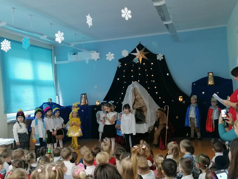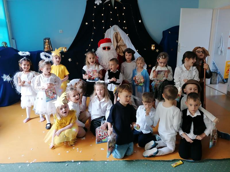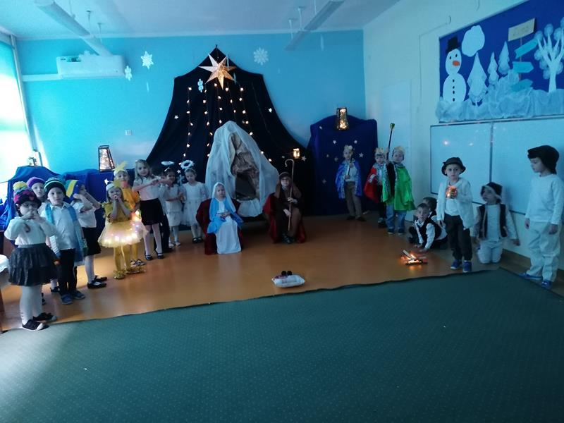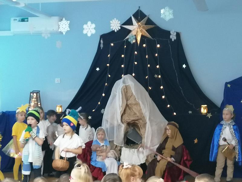 19 grudnia 2025r. sala "Stokrotek" zmieniła swoje oblicze: pojawiło się rozgwieżdżone niebo, stajenka ze żłóbkiem oraz dzieci w pięknych strojach, przedstawiające historię Bożego Narodzenia. Salę wypełniły dzieci ze wszystkich grup wraz ze swoimi ciociami, wszyscy pracownicy przedszkola oraz zaproszeni goście.