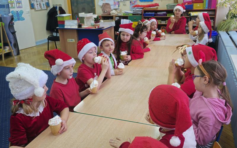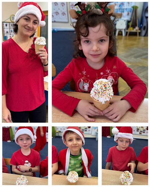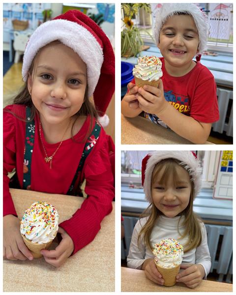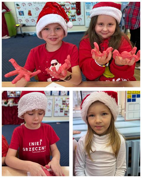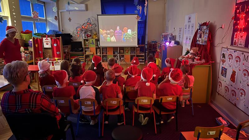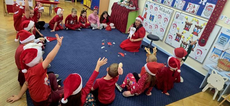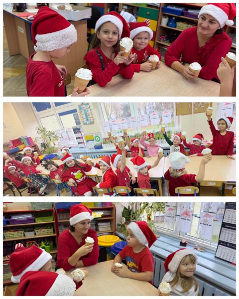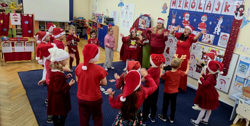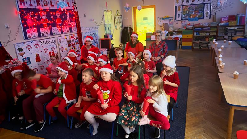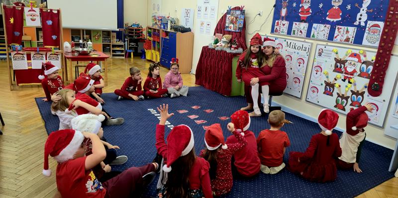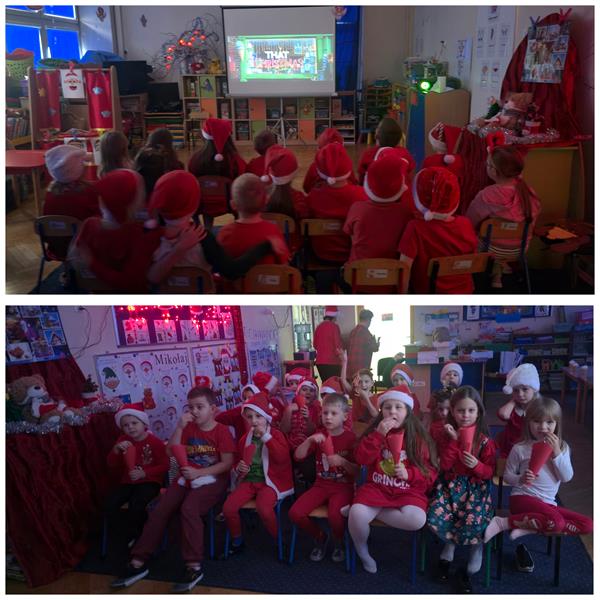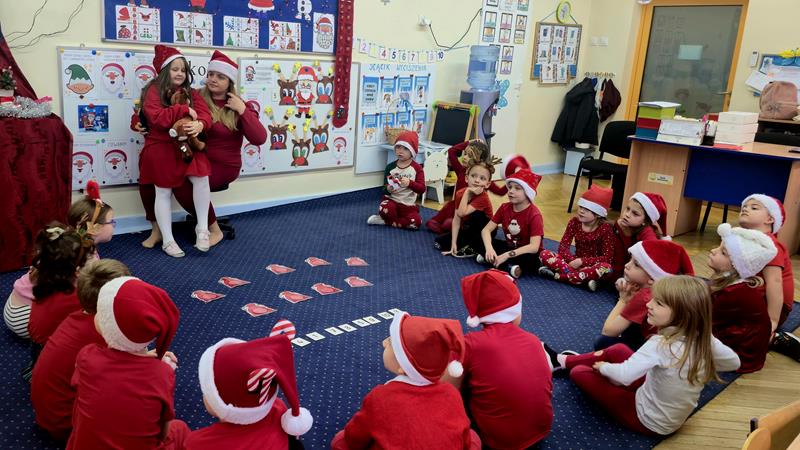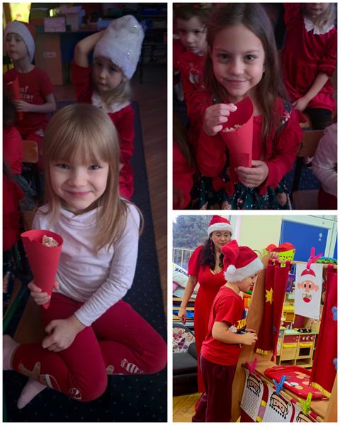 5.12.25 r. "Motylki" w czerwonych strojach do przedszkola przybyły i mamę Tosi w sali gościły. Wierszyka pt. "Mikołaj" wysłuchały i świąteczne zagadki rozwiązywały. Piankolinę w kolorze czerwonym tworzyły i serduszka dla Św. Mikołaja z niej lepiły. Równania matematyczne rozwiązywały i ciasteczkami mikołaja częstowały. Mikołajkowe prace plastyczne wykonywały i ciepłe lody konsumowały. Następnie do przedszkolnego kina się wybrały, film animowany o tematyce świątecznej obejrzały i rożki z popcornem w nagrodę za aktywność podczas zajęć otrzymały.