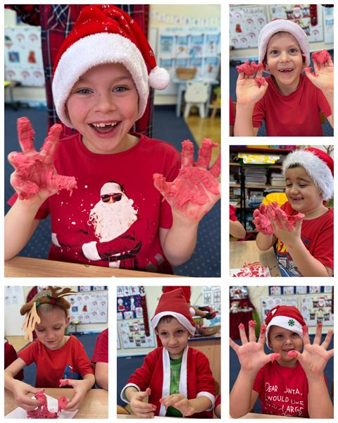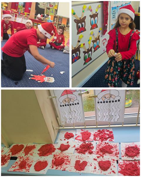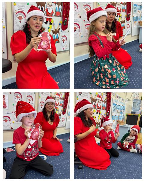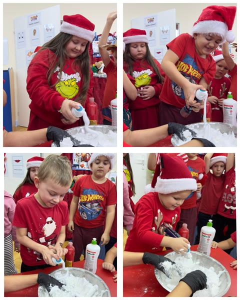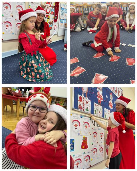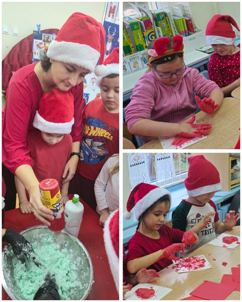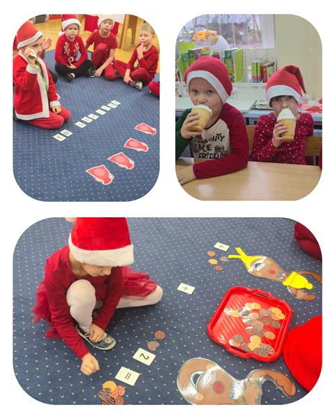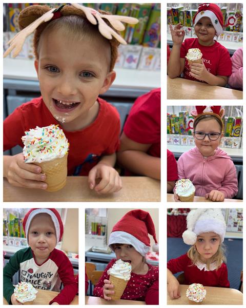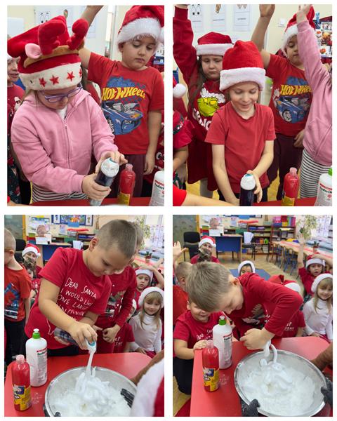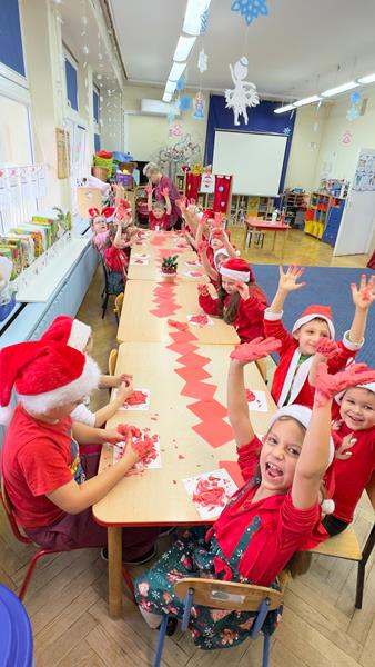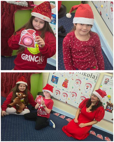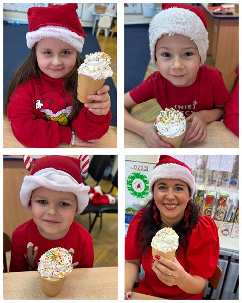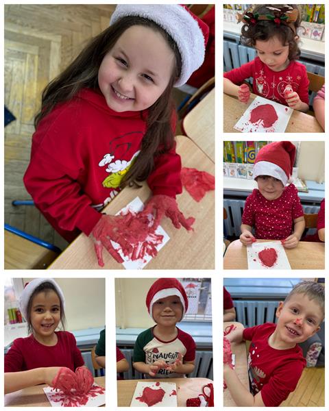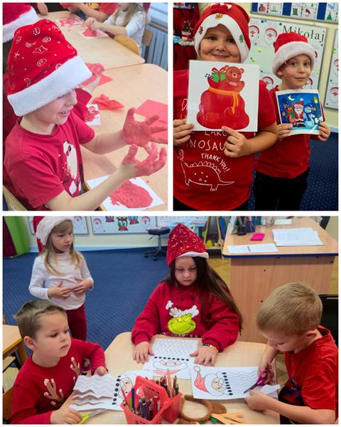 5.12.25 r. "Motylki" w czerwonych strojach do przedszkola przybyły i mamę Tosi w sali gościły. Wierszyka pt. "Mikołaj" wysłuchały i świąteczne zagadki rozwiązywały. Piankolinę w kolorze czerwonym tworzyły i serduszka dla Św. Mikołaja z niej lepiły. Równania matematyczne rozwiązywały i ciasteczkami mikołaja częstowały. Mikołajkowe prace plastyczne wykonywały i ciepłe lody konsumowały. Następnie do przedszkolnego kina się wybrały, film animowany o tematyce świątecznej obejrzały i rożki z popcornem w nagrodę za aktywność podczas zajęć otrzymały.