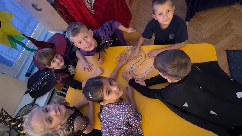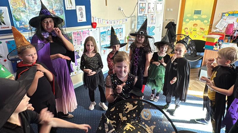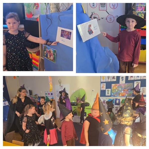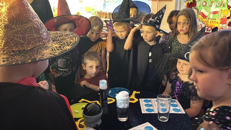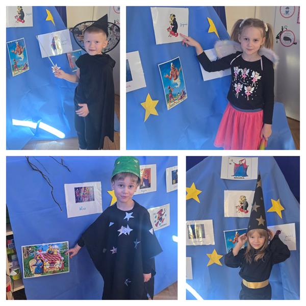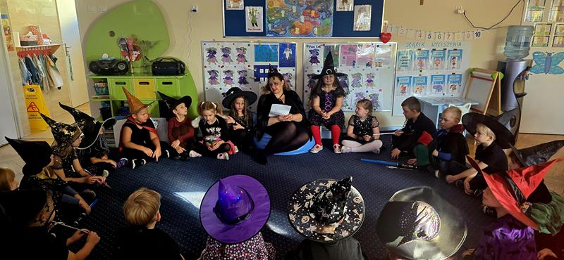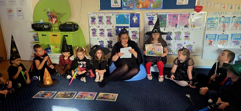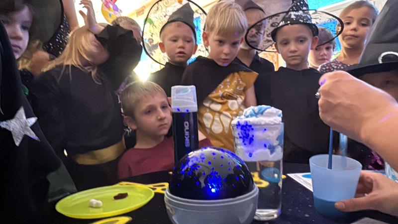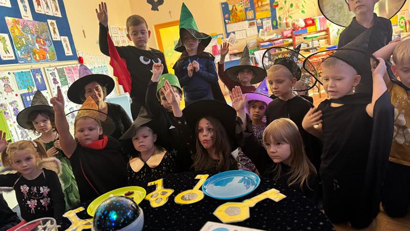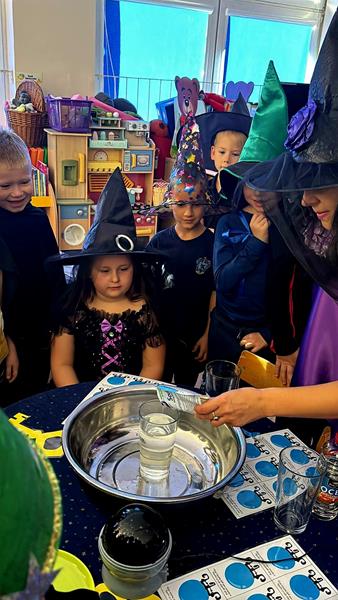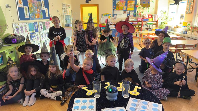 31.10.25 r. "Motylki" w przebraniach czarodziejów, czarodziejek i wróżek do przedszkola przybyły, mamę Tosi - panią Beatkę, na spotkanie czytelnicze zaprosiły i z postacią Pana Łał się zaznajomiły. Następnie w zabawach badawczych i eksperymentach uczestniczyły i Pana Łał do Krainy Zdziwienia doprowadziły. Magiczne malunki i rysunki tworzyły i wesoło się bawiły.
