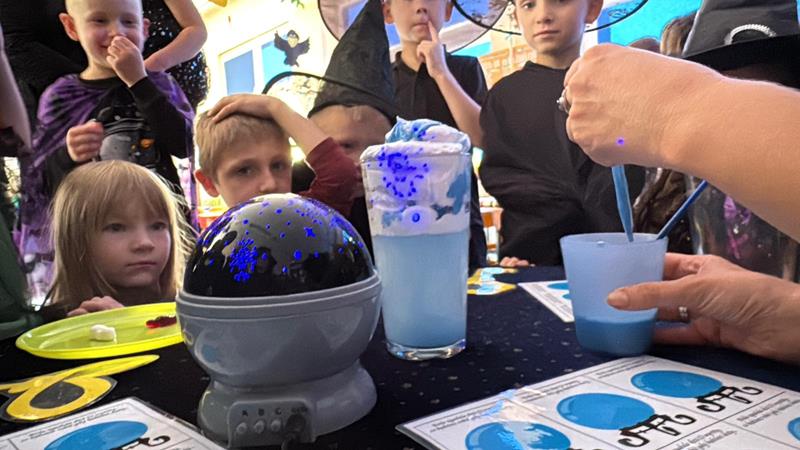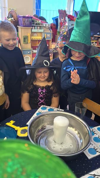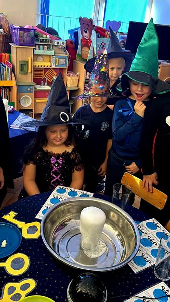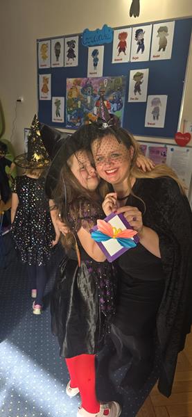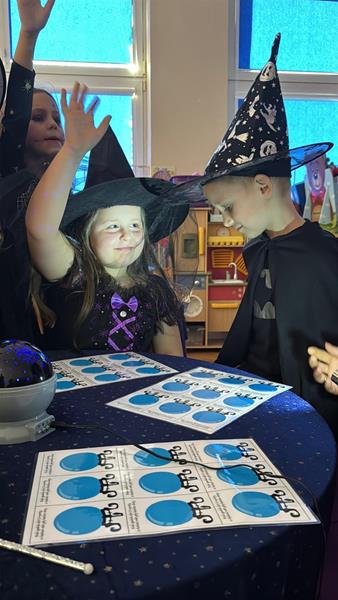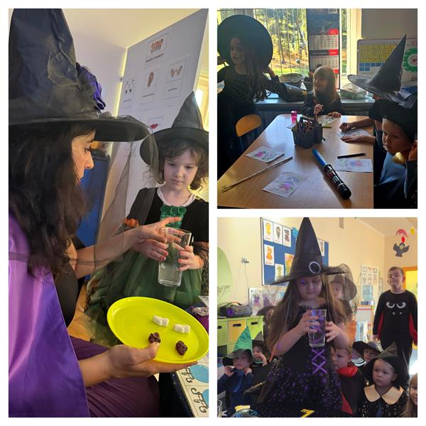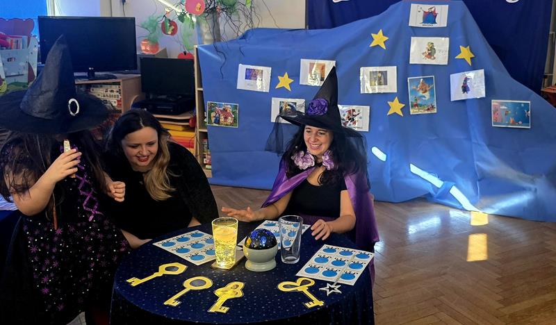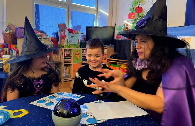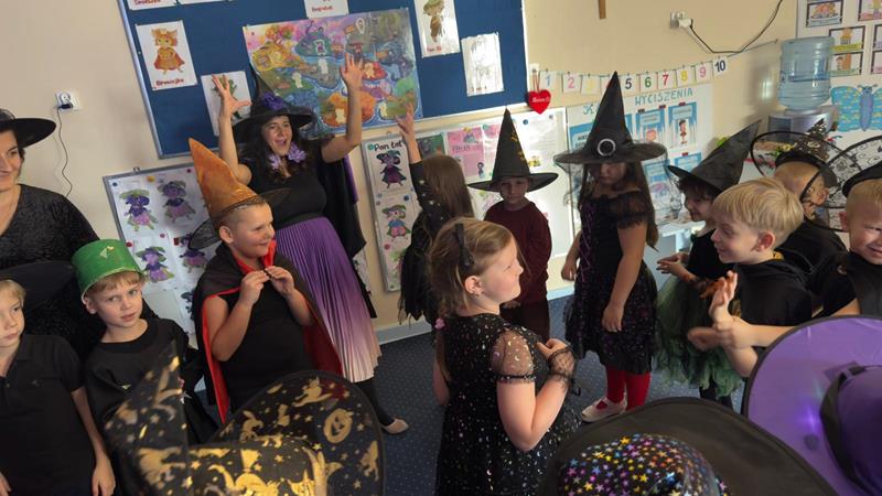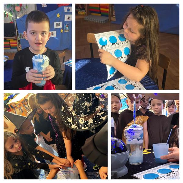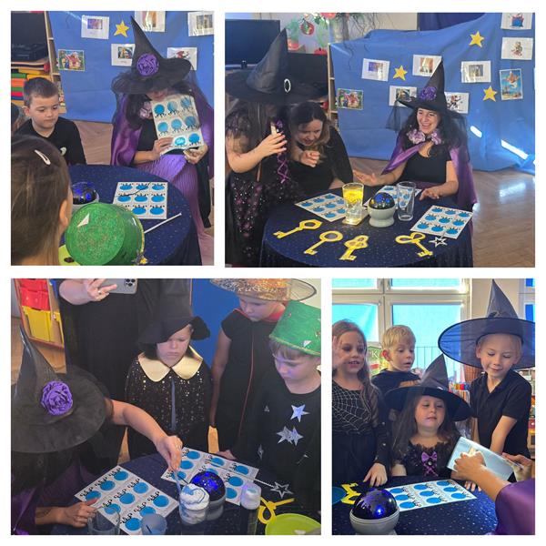 31.10.25 r. "Motylki" w przebraniach czarodziejów, czarodziejek i wróżek do przedszkola przybyły, mamę Tosi - panią Beatkę, na spotkanie czytelnicze zaprosiły i z postacią Pana Łał się zaznajomiły. Następnie w zabawach badawczych i eksperymentach uczestniczyły i Pana Łał do Krainy Zdziwienia doprowadziły. Magiczne malunki i rysunki tworzyły i wesoło się bawiły.