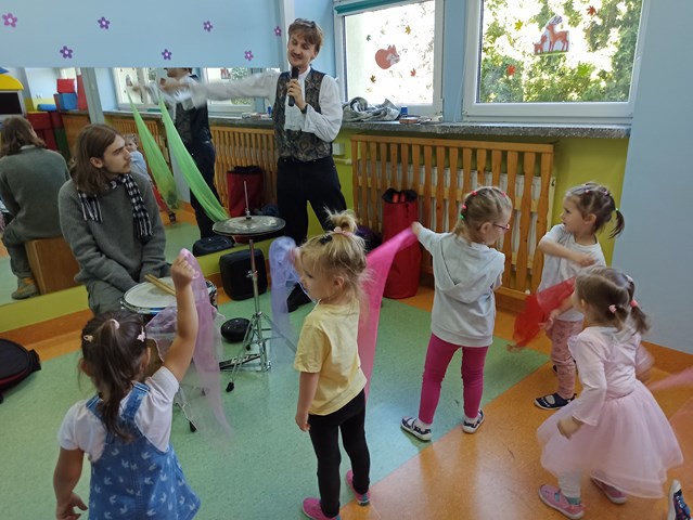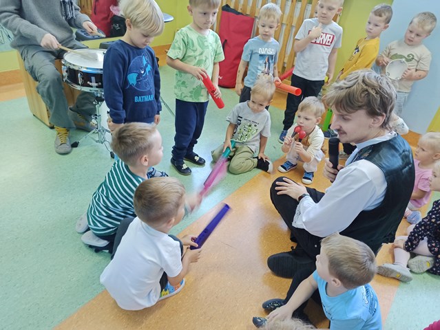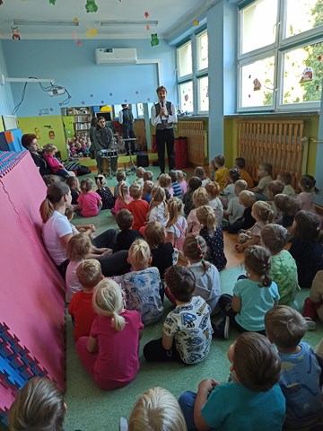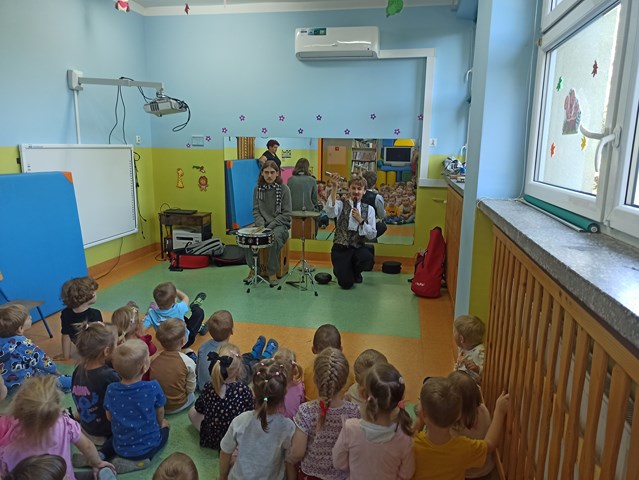 29.09.2025 roku "Bratki" brały czynny udział w Koncercie edukacyjnym pt."Rok zaczynamy z rytmem" w wykonaniu Akademii Bachmana. Zajęcia mają formę cykliczną, odbywają się raz w miesiącu. Spotkania są idealnym uzupełnieniem przedszkolnej edukacji muzycznej. Podczas koncertu dzieci poznały instrumenty perkusyjne i ich brzmienie: Bum Bum rurki, perkusję, marakasy. Zajęcia prowadzone są przez prelegenta Bachmana w zabawny sposób.
