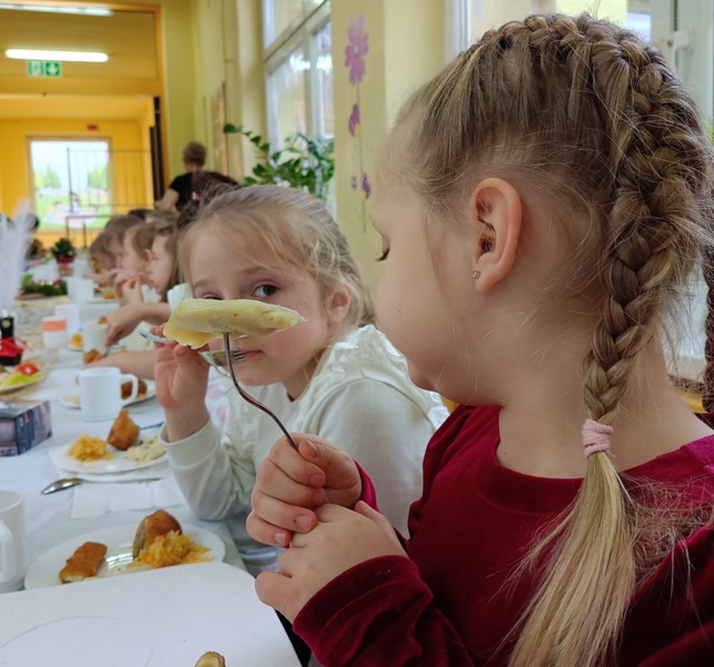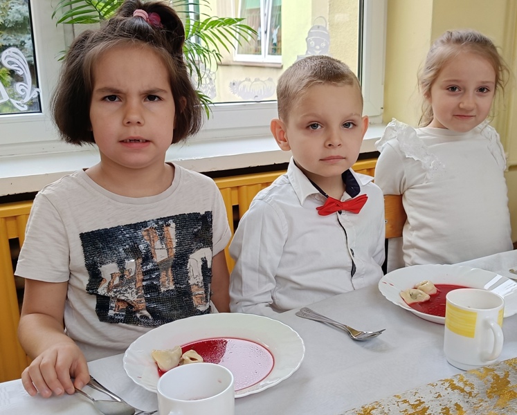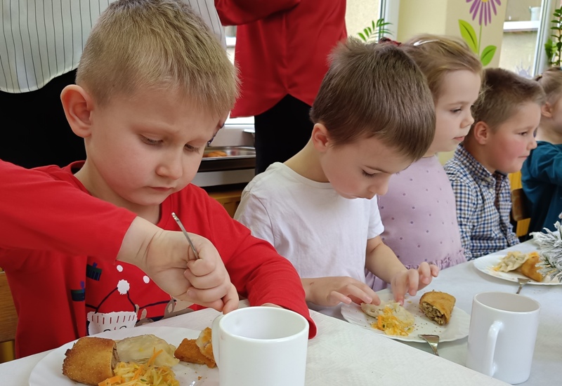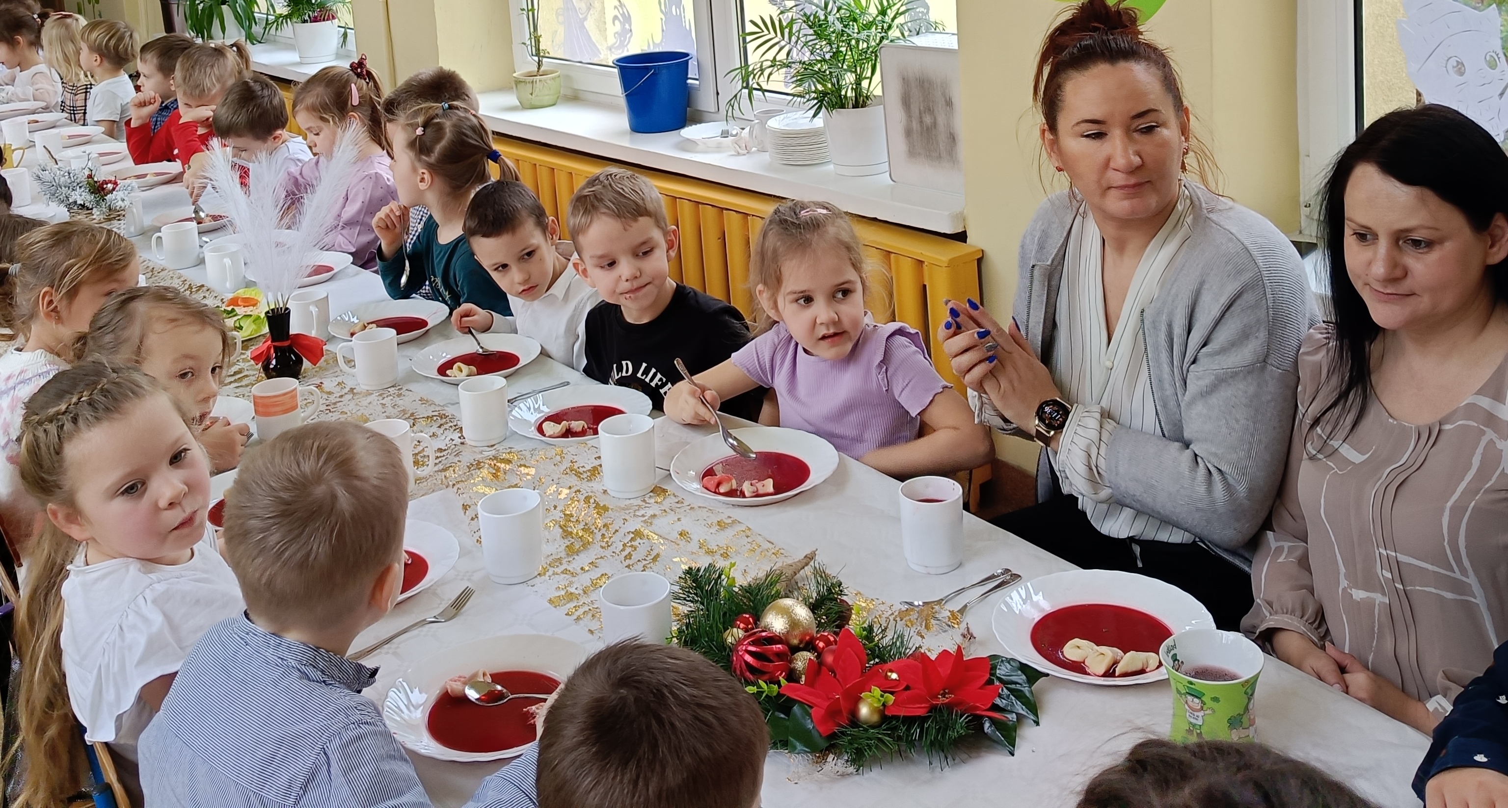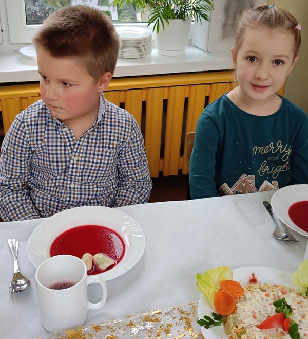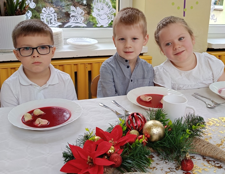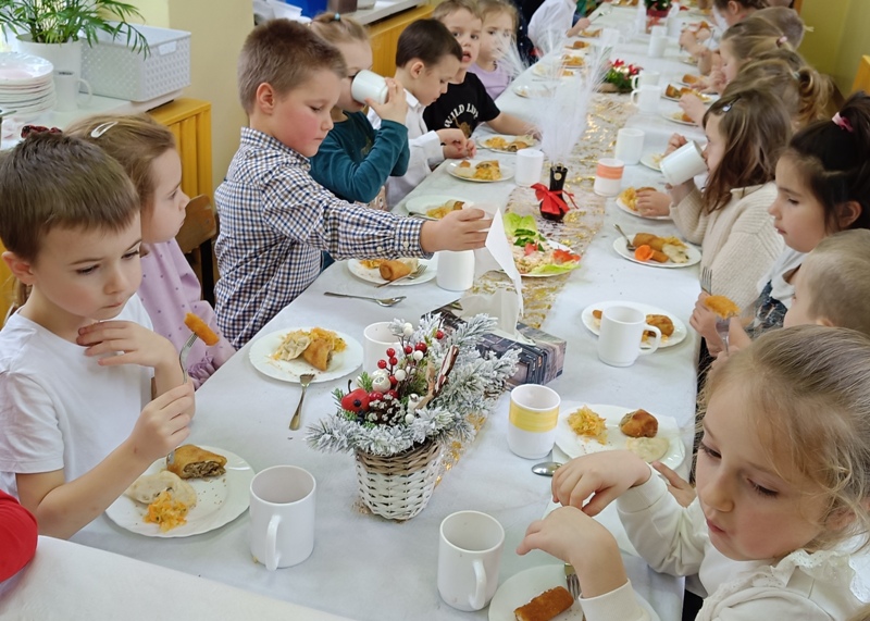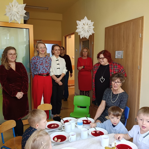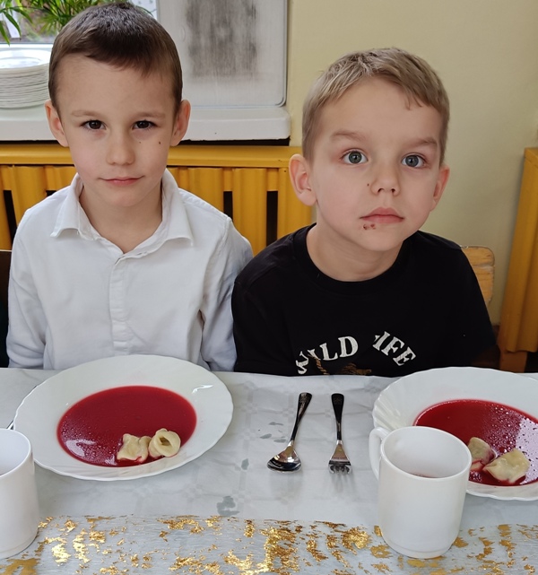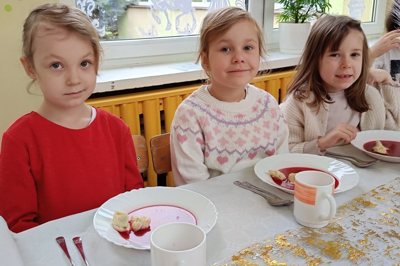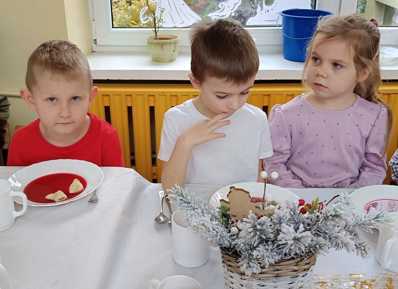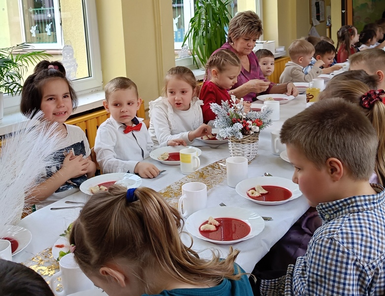 Dwie godziny później, w przedszkolu serwowano specjalny, świąteczny posiłek z okazji zbliżających się świąt. Obiad obejmował tradycyjne dania wigilijne: barszczyk czerwony z uszkami, rybne paluszki, pierogi, sałatka, makowiec, wszystko w świątecznej atmosferze.